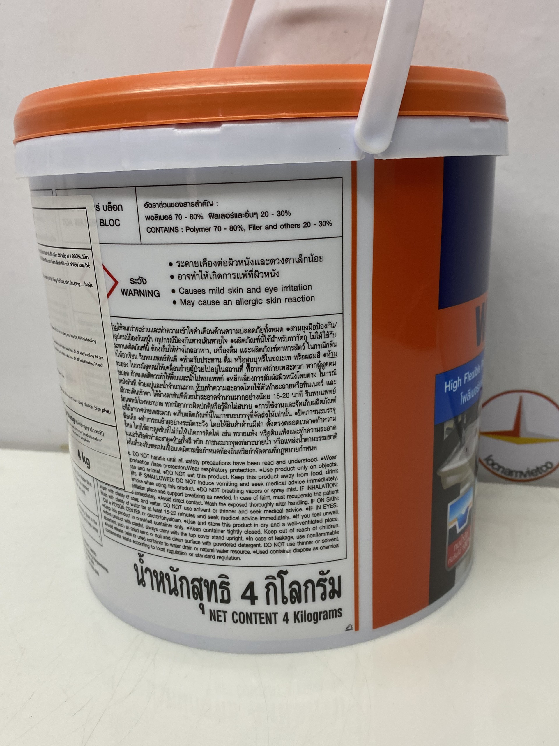 Mua tại TiktokChống thấm đàn hồi cho nền gạch cũ Toa Water Bloc 4Kg TOA Water Bloc là chất chống thấm gốc Polymer biến tính SBR đặc biệt, có tính chống thấm và cực kỳ linh hoạt với độ co dãn dài xấp xỉ 1000%, Sản phẩm có khả năng ngăn chặn sự xâm nhập của nước, chống lại áp suất thủy tĩnh thuận hoặc nghịch. Ngoài ra Toa Water Bloc còn bám dính tốt với nhiều loại bề mặt khác nhau như: Gạch cũ, bê tông, Gỗ ngói, kim loại, thạch cao, sẵn sàng để sử dụng và không độc hại. Công Dụng: TOA Water Bloc được sử dungjdder chống thấm cho các khu vực nhà tắm trước khi lát gạch, khu giặt, máng xối bê tốt, hồ bơi, sân thượng, Hoặc chống thấm cho nền gạch cũ mà không cần tháo giỡ gạch. Đặc điểm: