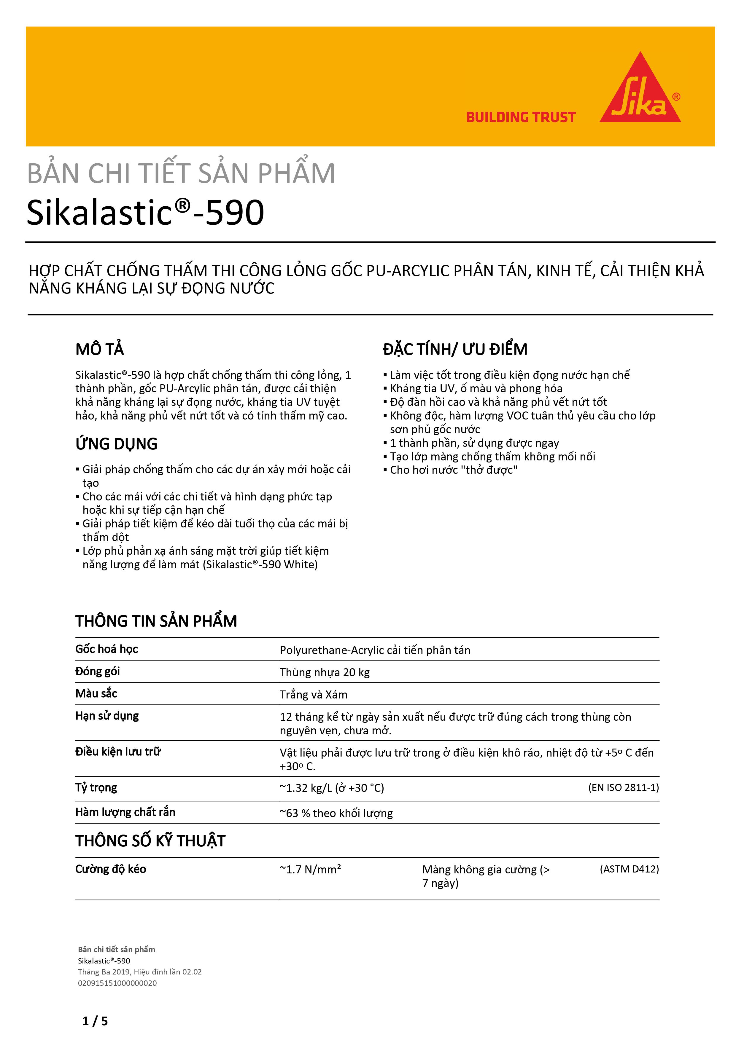 Sikalastic-590 là hỗn hợp chống thấm thi công lỏng, 1 thành phần, gốc PU - Acrylic phân tánĐóng gói: 20kg/thùngDạng/màu: Sệt/ màu xámHạn sử dụng 12 tháng kể từ ngày sản xuất