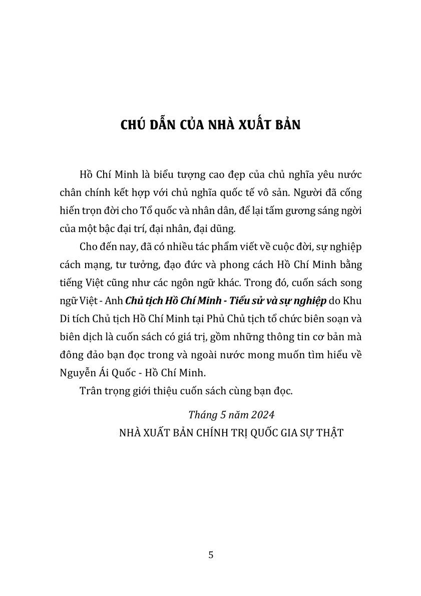 Cho đến nay, đã có nhiều tác phẩm viết về cuộc đời, sự nghiệp cách mạng, tư tưởng, đạo đức và phong cách Hồ Chí Minh bằng tiếng Việt cũng như các ngôn ngữ khác. Trong đó, cuốn sách song ngữ Việt - Anh Chủ tịch Hồ Chí Minh - Tiểu sử và sự nghiệp do Khu Di tích Chủ tịch Hồ Chí Minh tại Phủ Chủ tịch tổ chức biên soạn và biên dịch là cuốn sách có giá trị, gồm những thông tin cơ bản mà đông đảo bạn đọc trong và ngoài nước mong muốn tìm hiểu về Nguyễn Ái Quốc - Hồ Chí Minh.