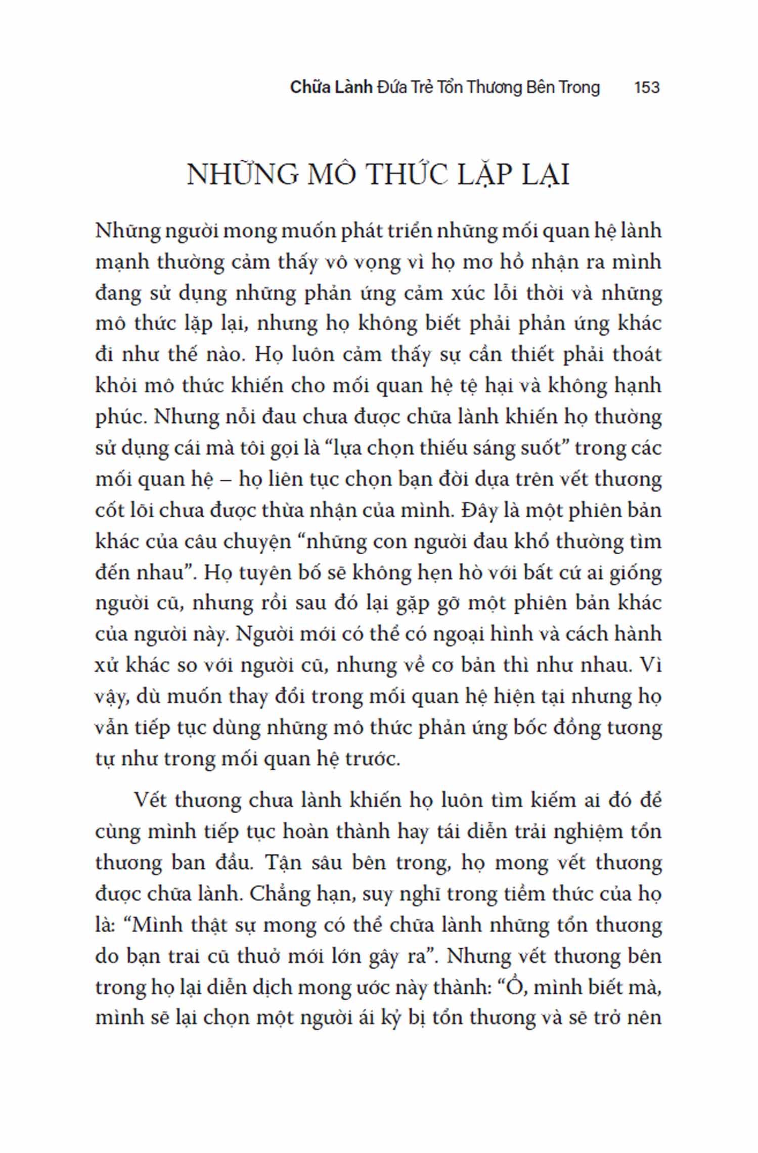 Thông qua các bài tập và câu chuyện của những người đã được chữa lành cũng như của chính tác giả, cuốn sách hướng dẫn làm thế nào để thấu hiểu “đứa trẻ tổn thương” bên trong chính m.ình và cách để kết nối phần nội tâm này với “phần trưởng thành”. Chẳng hạn như nhìn lại dòng sự kiện thời thơ ấu, viết thư trao đổi giữa phần trưởng thành và phần tổn thương, liên hệ những phản ứng bốc đồng trong hiện tại với nguyên nhân trong quá khứ… Việc viết những lá thư chữa lành qua lại với chính m.ình là một cách tuyệt vời để nhanh chóng làm bộc lộ những cảm xúc và kết nối với phần tổn thương bên trong bạn. Bạn đọc cũng sẽ hiểu cách mà “phần người lớn có trách nhiệm” có thể phát triển một bộ công cụ hồi đáp mới, tích cực hơn, thay thế cho những kiểu phản ứng cũ của đứa trẻ tổn thương bên trong.