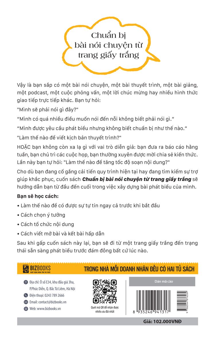 Bạn đang tự hỏi làm thế nào để định hình suy nghĩ của bản thân thành một bài phát biểu, bạn nhìn chằm chằm chằm vào trang giấy trắng. Bạn gặp vấn đề trong mọi khâu từ lúc lập dàn ý bài thuyết trình, phong thái, cách giao tiếp, kết nối với những người ở dưới. Tất cả các vấn đề đều được giải quyết trong cuốn sách “Chuẩn bị bài nói chuyện từ trang giấy trắng”. Cuốn sách có tính ứng dụng cao, thiết thực, cung cấp cho bạn một cấu trúc bài phát biểu đơn giản có thể dùng lại được nhiều lần và các bước để tự tin trước đám đông. Với các bước và các ví dụ đi kèm của tác giả, bạn sẽ nắm được 6 bước cơ bản để tạo nên bài thuyết trình hiệu quả, cách phát triển các ý, lời mở đầu, kết thúc và giao tiếp hoàn hảo.