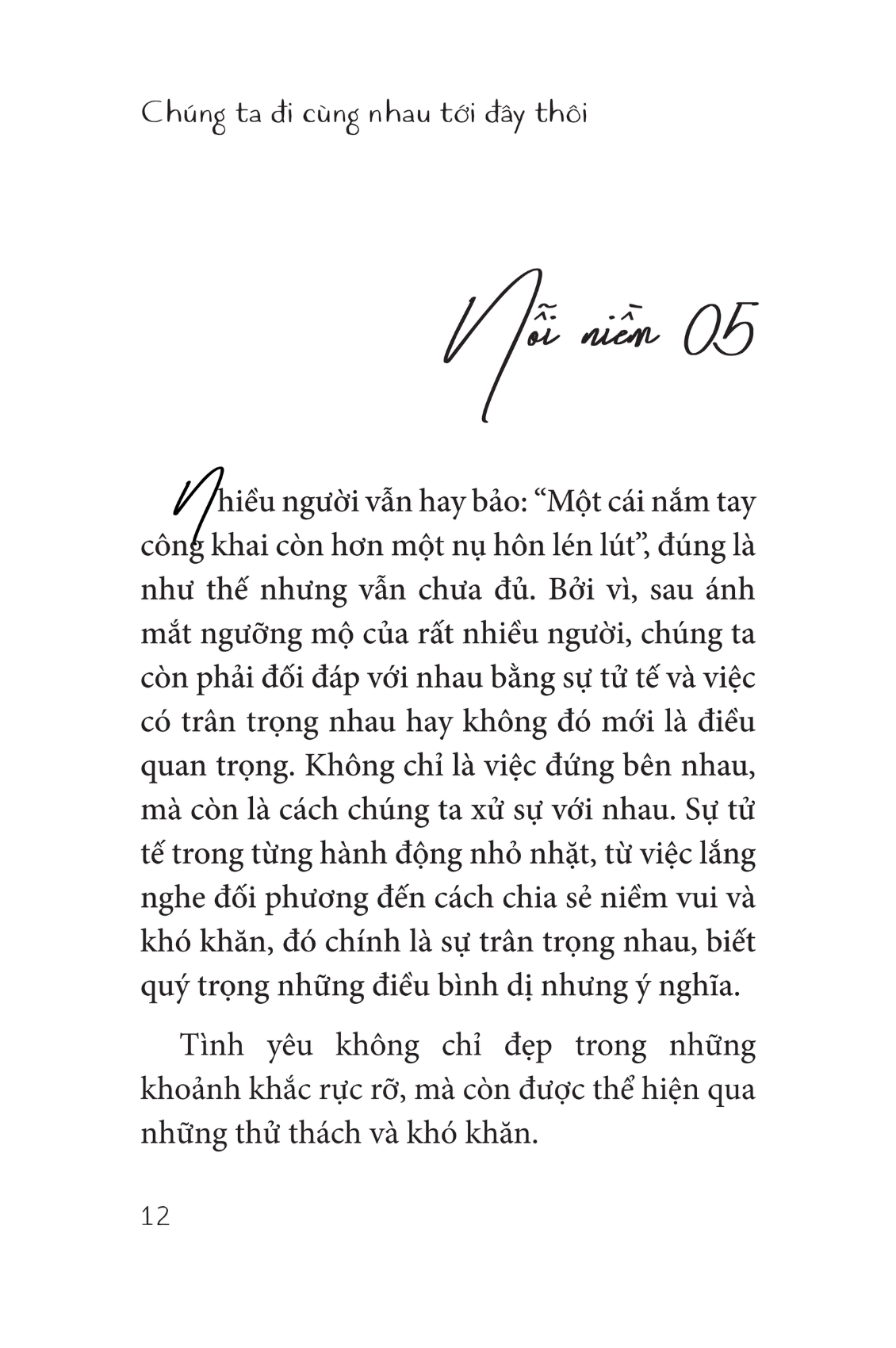 Nếu bạn đang ở trong giai đoạn khó khăn ấy, vậy thì chỉ mong bạn hiểu rằng bạn không cô đơn đâu. Có ai từng yêu mà chưa từng nếm trải đắng cay? Trong cuốn sách “Chúng ta đi cùng nhau tới đây thôi” tác giả Mi Nói đã gói ghém tất cả những kỷ niệm, những nhiệt thành tuổi trẻ, để trải lòng, để đồng cảm với những trái tim đang cần được chữa lành.