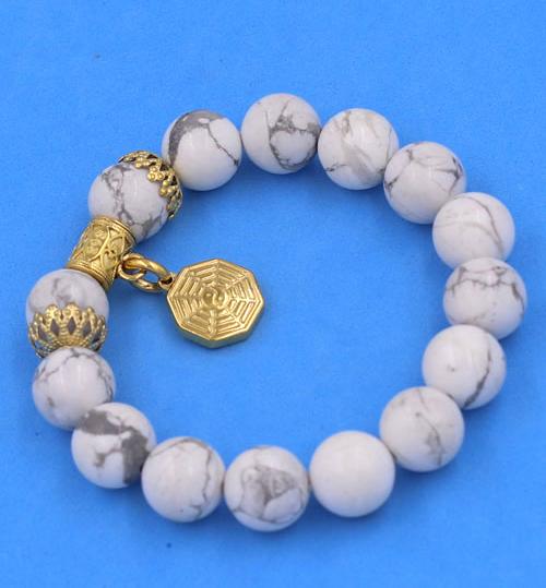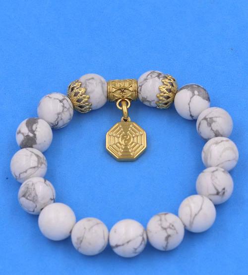 ✨Chuỗi vòng tay Đá White Howlite 12 ly - Vòng tay Bát Quái inox vàng VHWLBQHKV12 - hợp mệnh Kim, mệnh Thủy