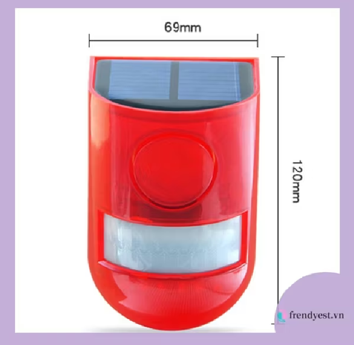 Hướng dẫn sử dụng: Nhấn giữ nút khởi động , sau khi khởi động chuông sẽ nháy đèn và kêu lên. Sau khi đợi hết chuông và nháy đèn bạn bấm thêm 1 lần nút khởi động để chọn chế độ 1. Sau khi chọn chế độ 1, chuông sẽ cần 10 giây để thiết lập chế độ làm việc bằng cách nháy đèn, khi chuông hết nháy đèn là bạn đã thiết lập xong chế độ làm việc 1. Làm tương tự để chọn chế độ làm việc 2-3-4. Mỗi lần chuyển đổi giữa các chế độ, đèn mất 15~20 giây để thiết lập, bạn hãy đợi chút nhé !!! Chế độ làm việc: - Chế độ 1 : Phát sáng và báo động ( cách kiểm tra: dùng tay chạm vào phần nháy đèn = phần cảm ứng hồng ngoại ) - Chế độ 2 : Nhấp nháy 24 giờ mà không báo động ( cách kiểcm tra: dùng tay chạm vào phần nháy đèn = phần cảm ứng hồng ngoại ) - Chế độ 3 : Buổi tối phát sáng và báo động ( ban ngày không hoạt động) (cách kiểcm tra: dùng tay che tấm pin năng lượng mặt trời) - Chế độ 4 : Buổi tối nhấp nháy không báo động ( ban ngày không hoạt động ) (cách kiểcm tra: dùng tay che tấm pin năng lượng mặt trời) Khi báo động chuông sẽ nháy đèn/kêu lên trong vòng 1 PHÚT. Chức năng : - Đèn LED: 6 chip Led màu đỏ nhấp nháy - Chất liệu: Nhựa ABS - Chế độ sạc : sạc năng lượng mặt trời - Thời gian sạc : 6-8 giờ - Thời gian làm việc: Cảm ứng 45 giây phát sáng và báo động tối đa 300 lần, sạc đầy 1 lần dùng được 30 ngày - Âm thanh báo động: 129dB - Chống thấm nước: IP65 - Pin: 3.7V . 400mA Lithium - Khoảng cách cảm ứng: 5-8 mét (bị ảnh hưởng bởi nhiệt độ môi trường), góc cảm ứng: 110 ° - Kích thước: 70x70x120mm