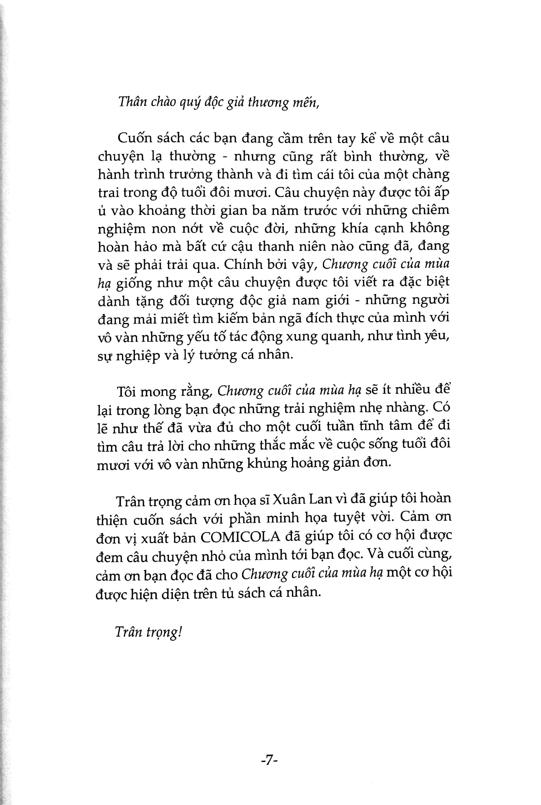 Chương Cuối Của Mùa Hạ viết về một cuộc gặp gỡ định mệnh như thế của chàng trai tên Xuân. Cuốn tiểu thuyết với nhiều tình tiết độc đáo, cách xây dựng nhân vật và tình huống, cùng cách kể chuyện mới lạ, đầy bất ngờ khiến người đọc bị lôi cuốn vào nó. Ngay từ cái tên của nhân vật đều đã khiến nhiều người tò mò, Xuân, Hạ, Thu, Đông, 4 con người với 4 cái tên đặc biệt ấy đã khiến người ta phải đặt câu hỏi: Giữa họ sẽ tạo nên một câu chuyện thế nào.