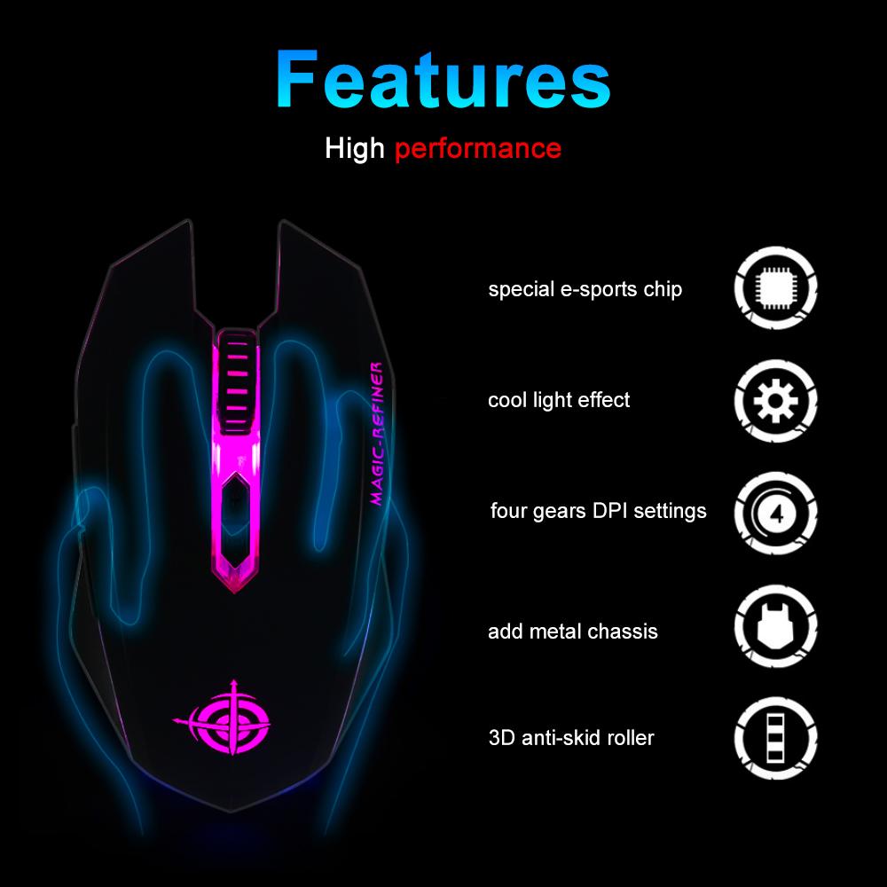 High performance with special e-sports chip, cool light effect, four gears DPI settings, add metal chassis and 3D anti-skid roller.