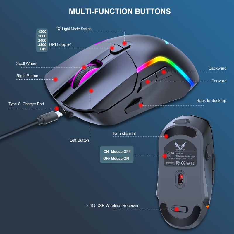 - DPI (độ nhạy): 2400dpi - Dung lượng pin: pin sạc 500mAH giúp bạn thoải mái sử dụng mà không lo hết pin. - Kết nối không dây 2.4G đáng tin cậy và chuột có