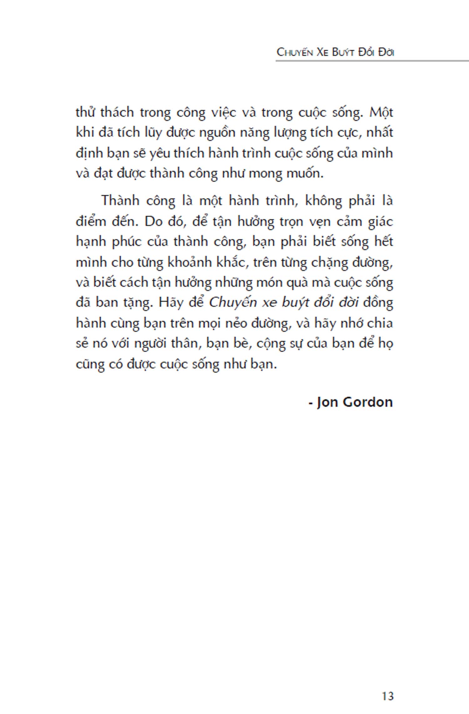 Từ kinh nghiệm của bản thân cũng như những người xung quanh, tác giả Jon Gordon đã tìm ra mười quy tắc giúp mọi người xây dựng nguồn năng lượng tích cực. Các quy tắc được ông truyền tải một cách dễ hiểu thông qua câu chuyện của George trong cuốn sách “Chuyến xe buýt đổi đời” (tái bản từ cuốn Chuyến xe năng lượng).