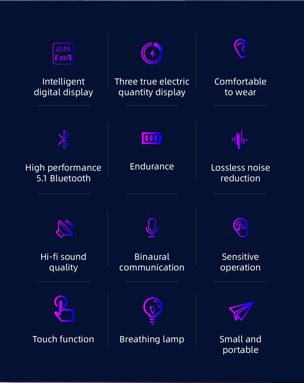 Features: Adopt DSP anti-interference chip and BT5.0 chip, fast and stable transmission, low power consumption. High-quality eight-core 13mm speaker unit, good sound quality, comfortable audio experience. CVC intelligent noise reduction technology can automatically reduct environmental