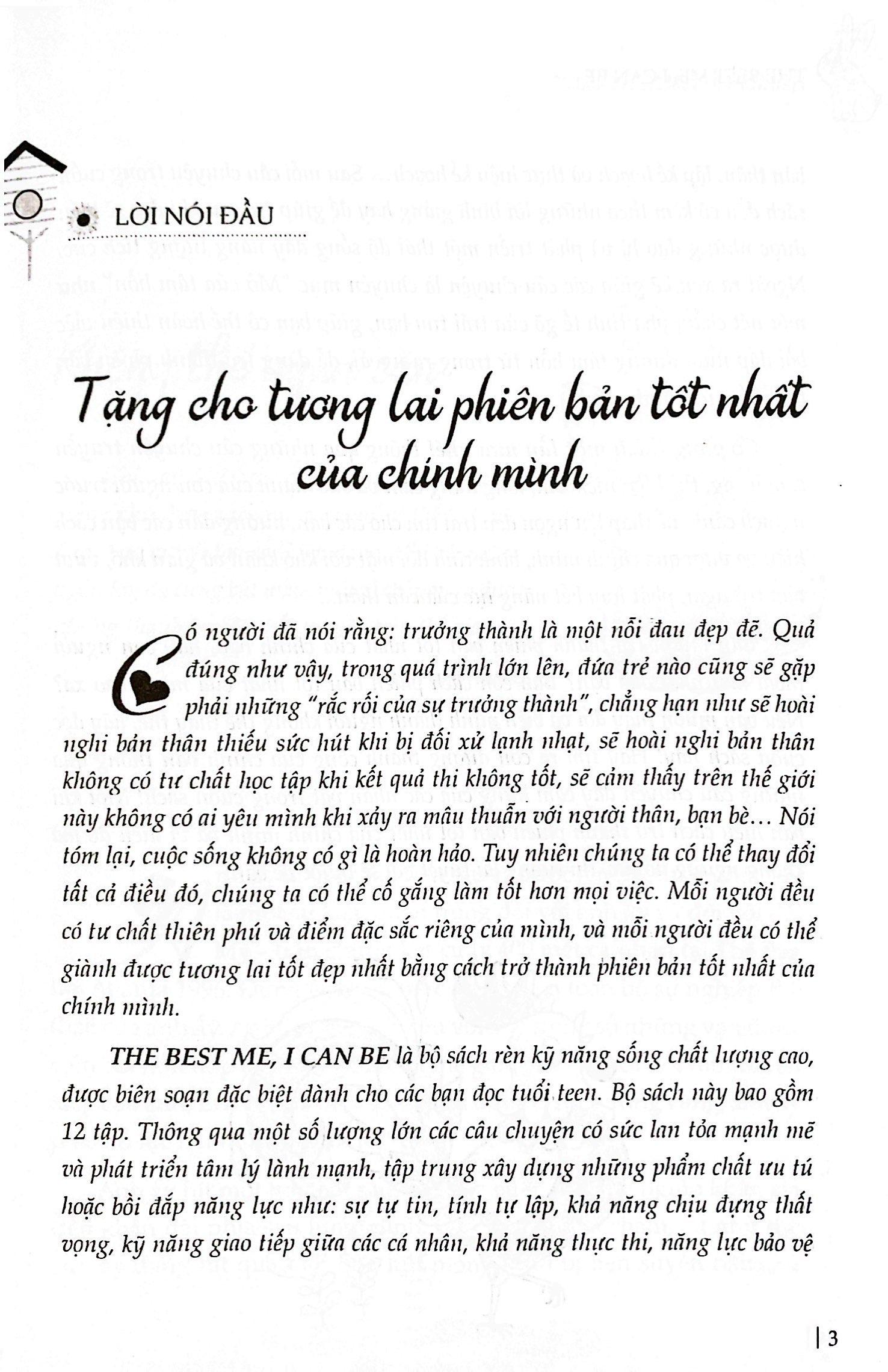 Mua tại TiktokThe Best Me, I Can Be là bộ sách rèn luyện kỹ năng sống chất lượng cao, được biên soạn đặt biệt dành cho các bạn tuổi teen. Bộ sách này gồm 12 tập. Thông qua một số lượng lớn các câu chuyện có sức lan tỏa mạnh mẽ và phát triển tâm lý lành mạnh, tập trung xây dựng những phẩm chất ưu tú và bồi đắp năng lực như: sự tự tin, tính tự lập, khả năng chịu đựng thất vọng, kỹ năng giao tiếp giữa các cá nhân, khả năng thực thi, nâng lực tự bảo vệ bản thân, lập kế hoạch và thực hiện kế hoạ