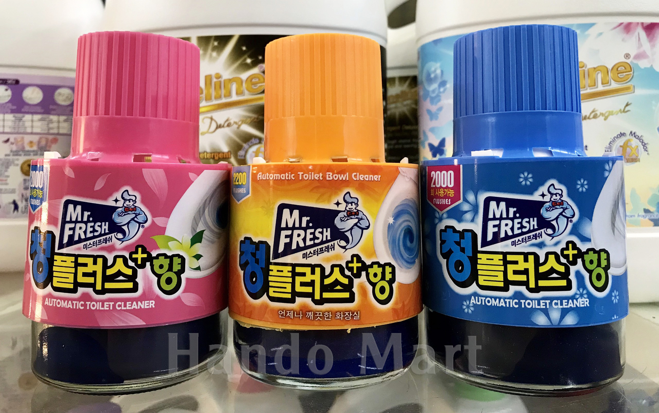 Tên SP: Cốc thả bồn cầu tẩy xanh toilet Mr.Fresh 180g hương Táo Quế Nhãn hiệu: Mr.Fresh Xuất xứ thương hiệu : Hàn Quốc Tạo màu xanh nước biển thanh mát và mang đến hương