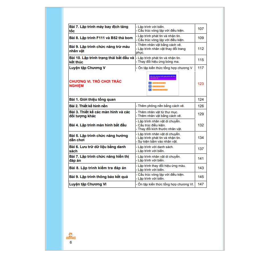 Cuốn sách Coding 5 lập trình với Scratch 3 bao gồm 06 chương, cung cấp những kiến thức tiếp theo về lập trình như: vòng lặp lồng nhau, thủ tục, danh sách, … thông qua ngôn ngữ lập trình Scratch 3. Từng chương trong cuốn sách Coding 5 sẽ giúp trẻ xây dựng lên các phần mềm phù hợp với lứa tuổi và gần gũi với các môn học khác như: Trắc nghiệm tiếng Anh, trò chơi trắc nghiệm, tri ân thầy cô, máy tính bỏ túi, trò chơi Điện biên phủ trên không, dịch ngôn ngữ.
