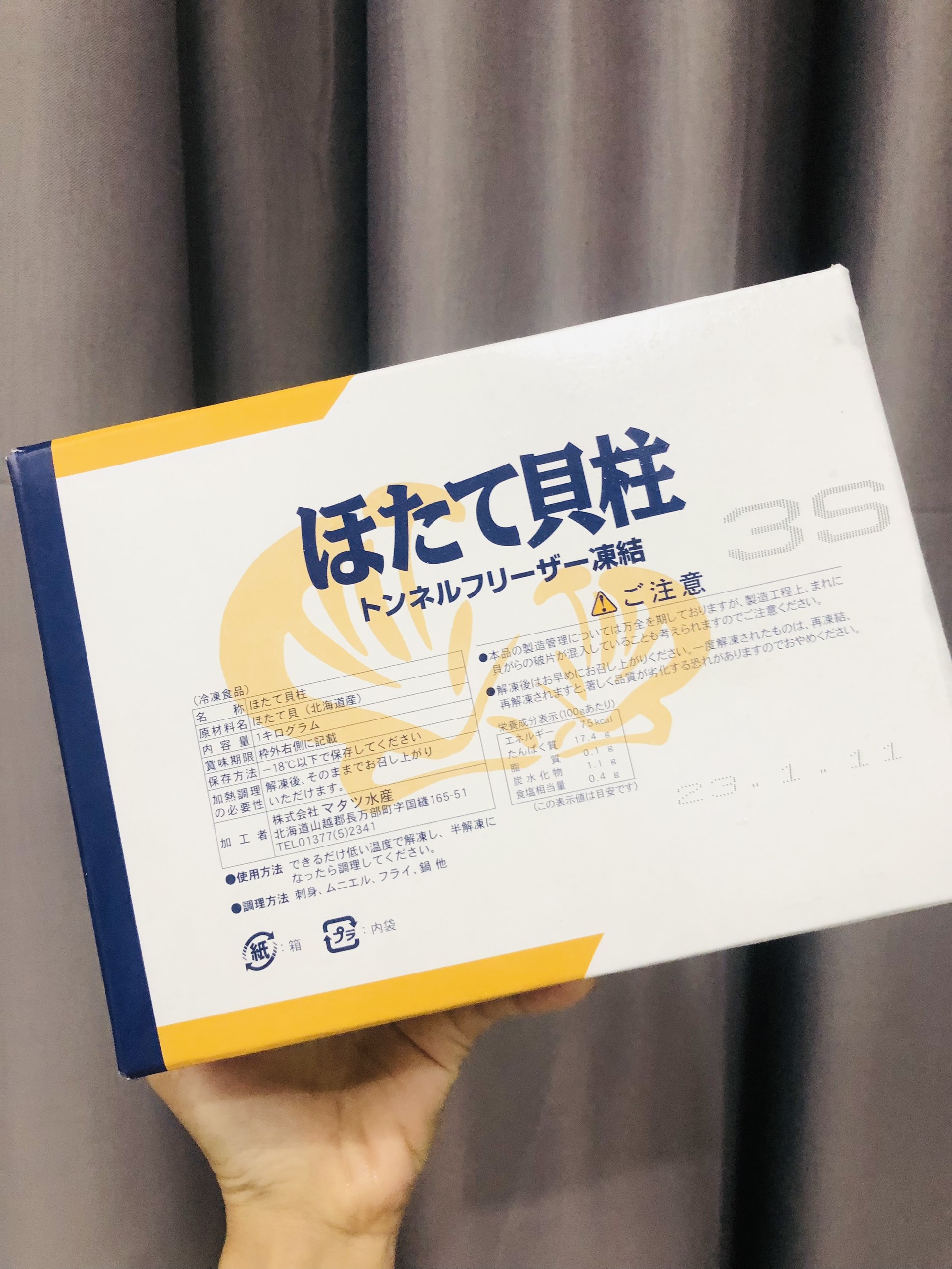 Với sản phẩm tươi sống, trọng lượng thực tế có thể chênh lệch khoảng 10%. Tên sản phẩm: CỒI SÒ ĐIỆP NHẬT SASHIMI HOKKAIDO Xuất xứ: Japan Đóng gói: 18-25, 26-30, 31-35 con/kg Bảo quản: Đông (-20 độ