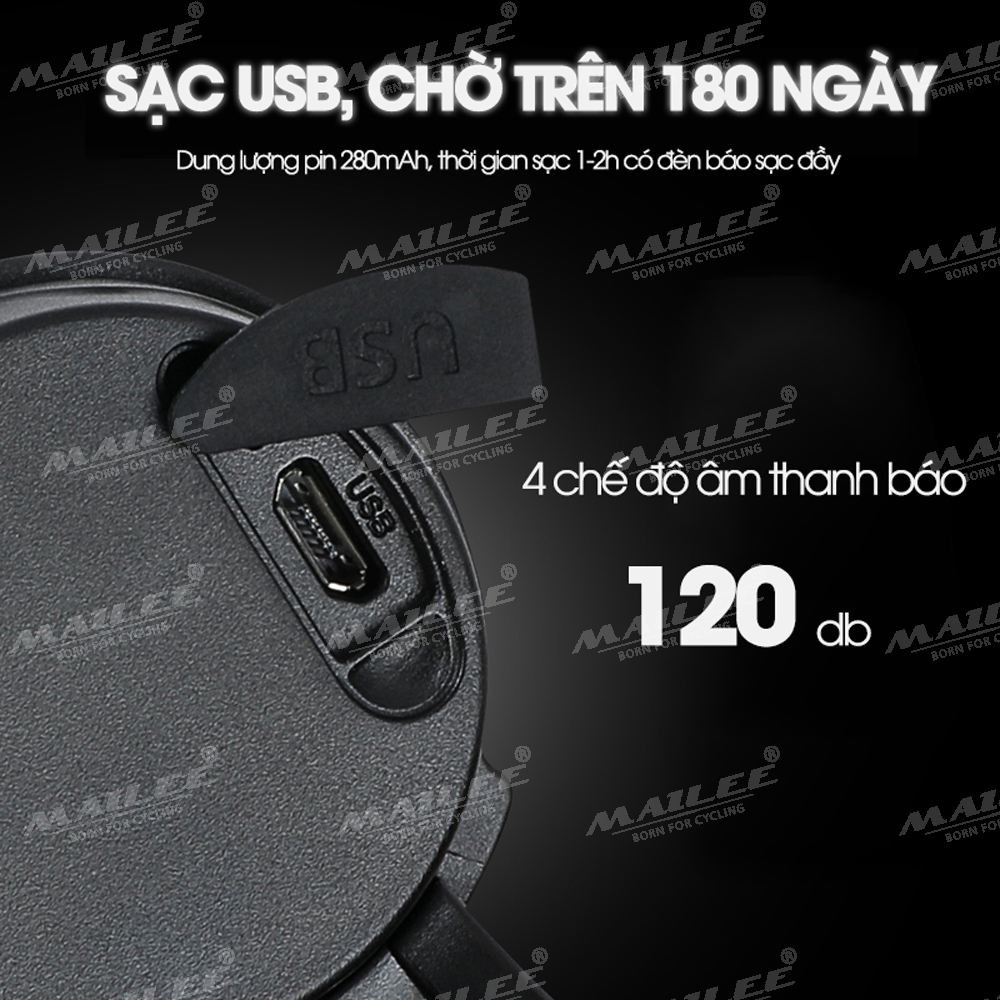 - Các tính năng: âm lượng lớn với 120dB, thiết kế gọn gàng không gây vướng khi đi xe, sạc trực tiếp USB