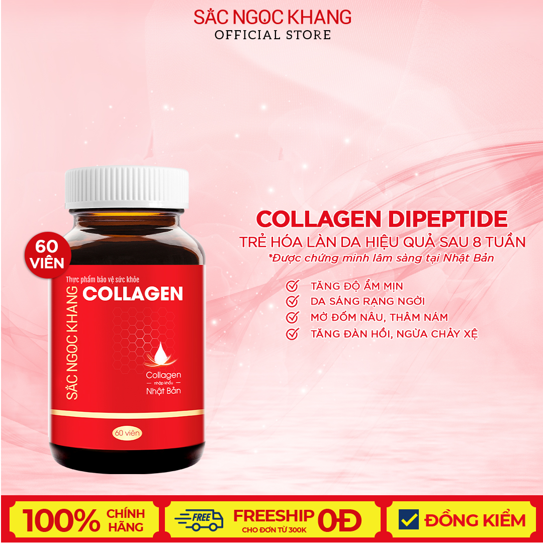 - Collagen đóng vai trò như một bộ khung chống đỡ bên dưới da, giúp làn da duy trì sự căng mịn và đàn hồi nhưng rất dễ suy giảm theo thời gian. Tuy nhiên, Các sợi collagen thông thường có cấu trúc phân tử lớn, nên rất khó hấp thu. Hiện nay, khoa học đã phát minh và áp dụng công nghệ thủy phân collagen. Công nghệ này cắt đứt sợi collagen ra thành vô số những mảnh rất nhỏ. Collagen Sắc Ngọc Khang là Collagen thủy phân có cấu trúc siêu phân tử, siêu mịn, siêu nhỏ, chỉ bằng 1/100 collagen thông thường, nên dễ dàng hấp thụ vào cơ thể.