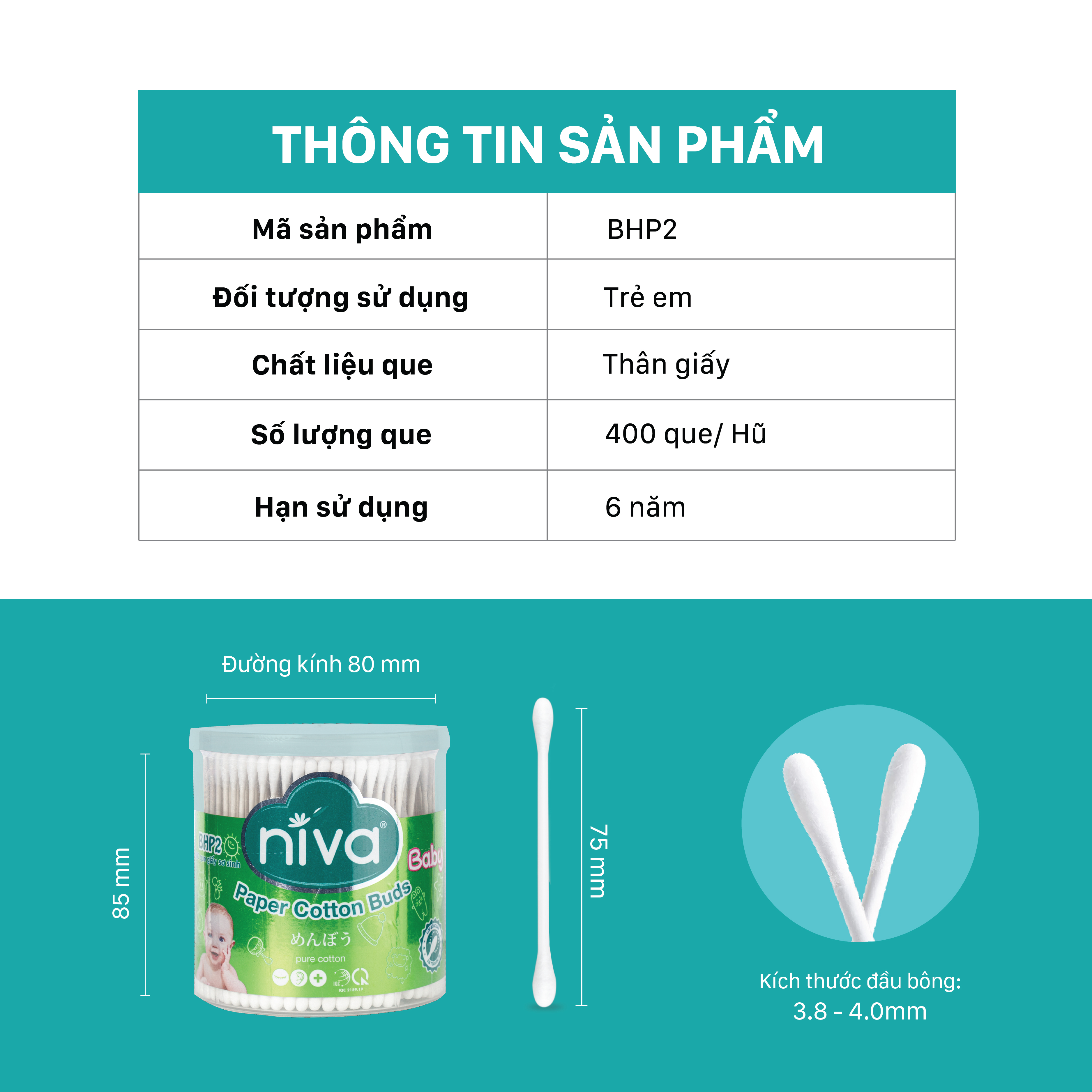 - Kích thước đầu bông từ 3.8 - 4.0 mm phù hợp với trẻ sơ sinh