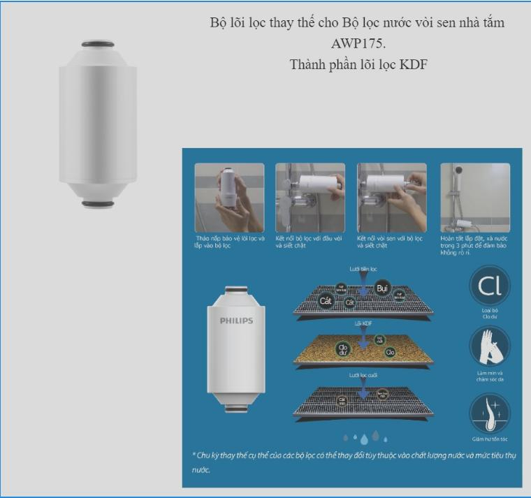 Combo 1 năm trải nghiệm nước sạch chăm sóc da & tóc cho phụ nữ và gia đình nhỏ với Bộ lọc nước tại vòi AWP1775 & Lõi lọc AWP175 Bộ sản phẩm bao gồm: 01 Bộ lọc nước vòi sen Philips AWP1775WH/74 02 Lõi lọc AWP175 (Lõi lọc thay thế cho Bộ lọc vòi sen Philips) THÔNG TIN CHI TIẾT 1. Bộ lọc nước vòi sen Philips AWP1775WH/74 Đặc điểm nổi bật: - Tốt cho làn da nhạy cảm của phụ nữ & trẻ nhỏ - Chăm sóc da & giảm hư tổn tóc - Dễ dàng lắp đặt vào vòi sen - Công nghệ lọc: KDF loại bỏ Clo hiệu quả Thông số chung: - Tuổi thọ lọc: 50,000L (hoặc lên đến 1 năm) - Công suất lọc: 8L/ phút - Chứng nhận bộ lọc: NSF - Thành phần bộ lọc: lưới lọc thô 1, bộ lọc KDF, lưới lọc thô 2 - Bảo hành 2 năm, vui lòng nhắn tin trực tiếp để được hướng dẫn chi tiết 2. Lõi lọc Xuất xứ thương hiệu: Hà Lan Nơi sản xuất: Trung Quốc