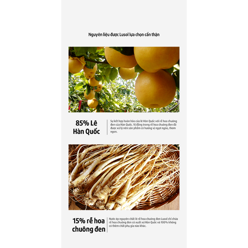 - Nước ép lê và rễ hoa chuông đen nguyên chất Lusol không chứa chất phụ gia, gồm 85% Lê Hàn Quốc và 15% Rễ hoa chuông đen Hàn Quốc được sản xuất trên dây chuyền đạt chuẩn HACCP.