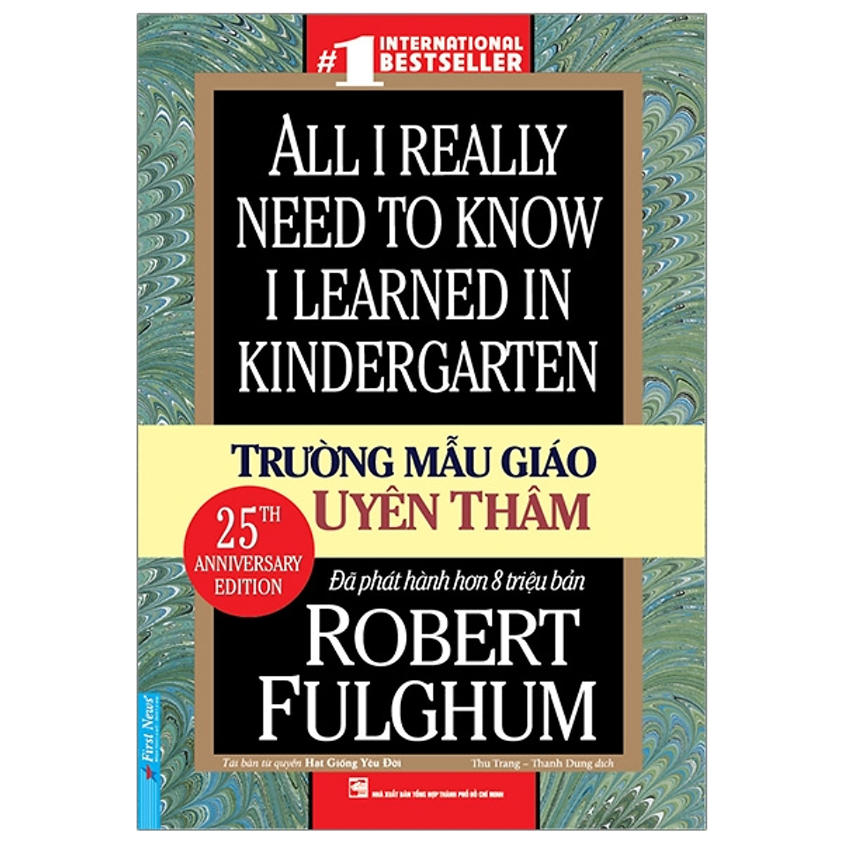 - Trường Mẫu Giáo Uyên Thâm Cuốn sách “Trường mẫu giáo uyên thâm’’ có tên gốc tiếng Anh là “All I really need to know I learned in Kindergarten” (Tất cả những điều tôi học được từ trường mẫu giáo). Cuốn sách được viết bởi Robert Fulghum – một triết gia, diễn giả ở tuổi 65. Vậy, điều gì đã khiến Fulghum đặt tên cho cuốn sách Best-seller New YorkTimes với trên 7 triệu bản in của mình một tựa đề gây tò mò đến vậy? Bởi ông nhận ra những điều căn bản - các quy tắc ở trường mẫu giáo như việc tự thu gọn, cất về chỗ cũ, cùng chia sẻ đồ chơi hay không được phép đánh bạn… chính là những kết tinh của những kinh nghiệm được chắt lọc và kiểm chứng trong xã hội loài người. “Ta trưởng thành qua những gì ta làm, chứ không phải qua những điều ta nghĩ. Điều này đúng cho cả trẻ em và người lớn, trong phạm vi lớp học lẫn quốc gia.” – Fulghum viết. Từ những mẩu truyện tưởng chừng như đơn giản và hồn nhiên như “Con nhện”, “Bút sáp màu”, “Trò chơi trốn tìm”… Fulghum đã đan cài vào đó nhiều lớp lang và chiều sâu một cách tinh tế những bài học cao cả và tuyệt vời về giá trị sống trong bao điều giản dị quanh ta. Đó là những ngẫm nghĩ về cuộc sống và cái chết, tình yêu và nỗi buồn, những giá trị và triết lý sống sâu sắc mà bất kỳ ai cũng phải suy ngẫm. Giá trị ẩn sau những bài học này là sự thấu hiểu để chúng ta có một cuộc sống hạnh phúc, tâm trí sáng suốt, sự vững tâm, lòng dũng cảm và niềm lạc quan trước bất kỳ sự thay đổi nào trong cuộc sống cũng như sự bình an trong tâm hồn. Đúng như tựa đề, “Trường mẫu giáo uyên thâm’’ là những mảnh ghép thú vị từ cuộc sống, những câu chuyện hài hước ý nhị nhưng ẩn chứa trong đó những bài học uyên thâm đến không ngờ. Cuốn sách là món quà giá trị và bất ngờ cho bất kỳ ai đang đi tìm hiểu bản chất của những giá trị căn nguyên nhất trong cuộc sống. Cuốn sách “Trường mẫu giáo uyên thâm’’ tái bản từ quyển “Hạt giống yêu đời”. Sách dài 240 trang, do First News thực hiện, NXB Tổng Hợp ấn hành.