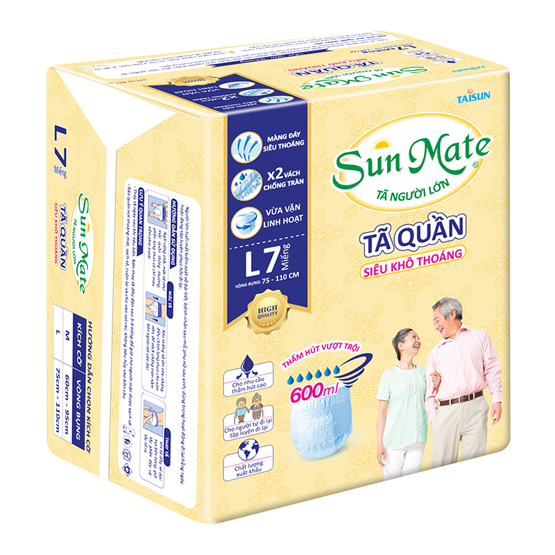 - Với công nghệ tiên tiến nhất tạo ra các sản phẩm mềm mại, thoáng khí, khả năng kháng khuẩn, nhằm giảm thiểu sự phát triển mùi và thấm hút cực nhanh, SunMate là lựa chọn tối ưu cho việc chăm sóc vệ sinh người cao tuổi, giúp họ luôn thoải mái, an toàn tự tin vui sống mỗi ngày. SunMate là người bạn đồng hành giúp chăm sóc người thân yêu tốt nhất.