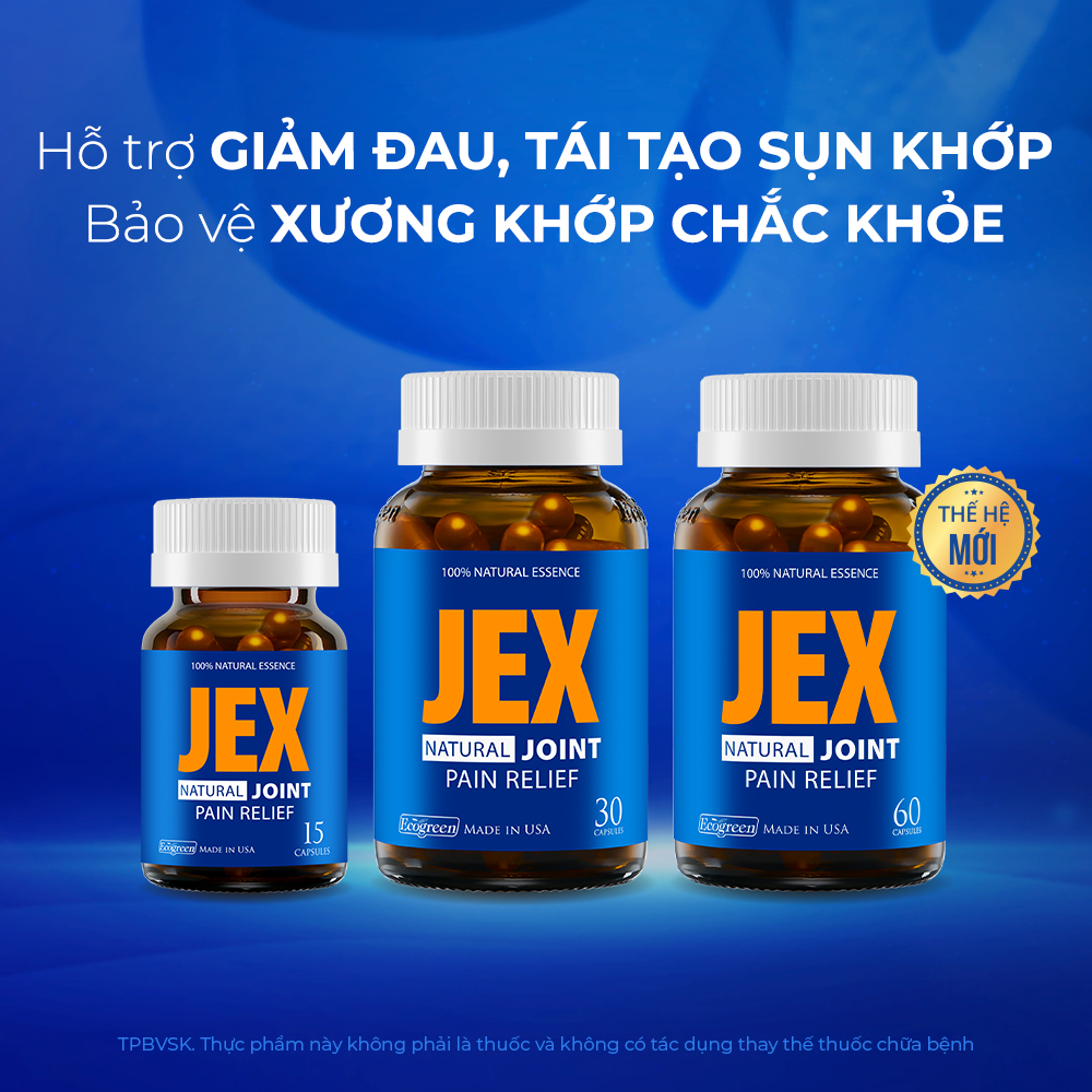 JEX thế hệ mới với bộ dưỡng chất đặc hiệu, giúp hỗ trợ ngăn chặn từ gốc các yếu tố gây viêm - nguyên nhân hàng đầu làm phá hủy xương khớp. Nhờ đó giúp hỗ trợ giảm đau nhanh, bền vững, an toàn, bảo vệ xương khớp chắc khỏe, toàn diện, giảm khả năng tái phát bệnh.