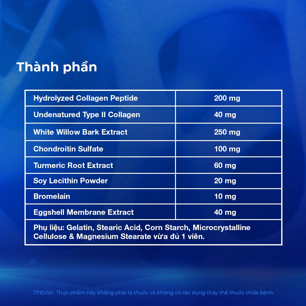 Thông tin chung: Thành phần: - Glucosamin sulfat 2KCl: 750mg - MSM: 120mg - Chondroitin sulfat natri 90%: 50mg - Collagen type 2: 30mg - Bột Sụn vi cá mập: 25mg - Bromelain 2400 GDU/g: