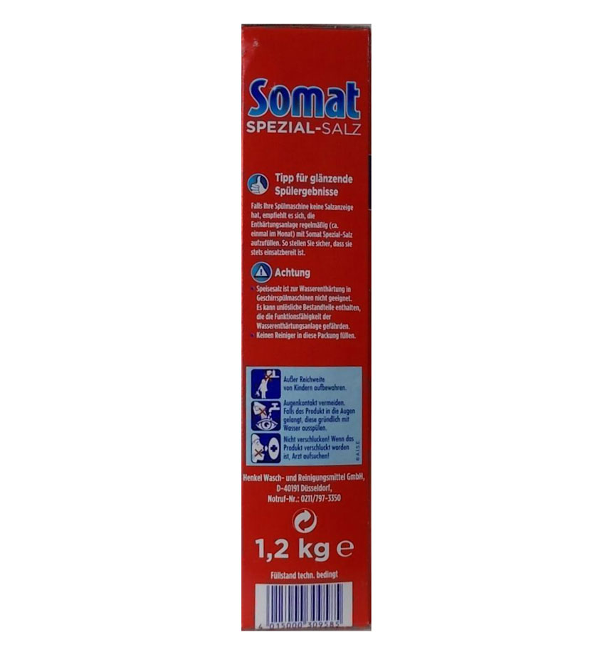 Muối rửa bát  somat special salt  chuyên dụng dành cho máy rửa bát. Khi sử dụng đổ 1luowngj vừa đủ vào bình đựng muối của máy và đổ thêm nước đầy vào bình chứa muối . Dùng thìa hoặc đũa có cán dài để quấy đều muối chứa trong bình như là quấy nước chanh với đường để muối có thể hòa tan với nước và làm tăng nồng độ của muối chứa trong bình đảm bảo cho chức năng của máy nhận biết và đo đếm được nồng độ muối báo hiệu cho bạn là muối đã đủ.