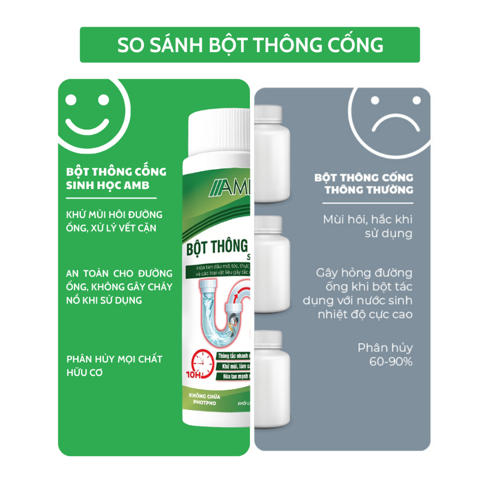 Bột thông cống sinh học AMB với công nghệ tiên tiến kết hợp các thành phần hoá học chuyên dụng tạo đ phân hủy chất cặn cực mạnh.