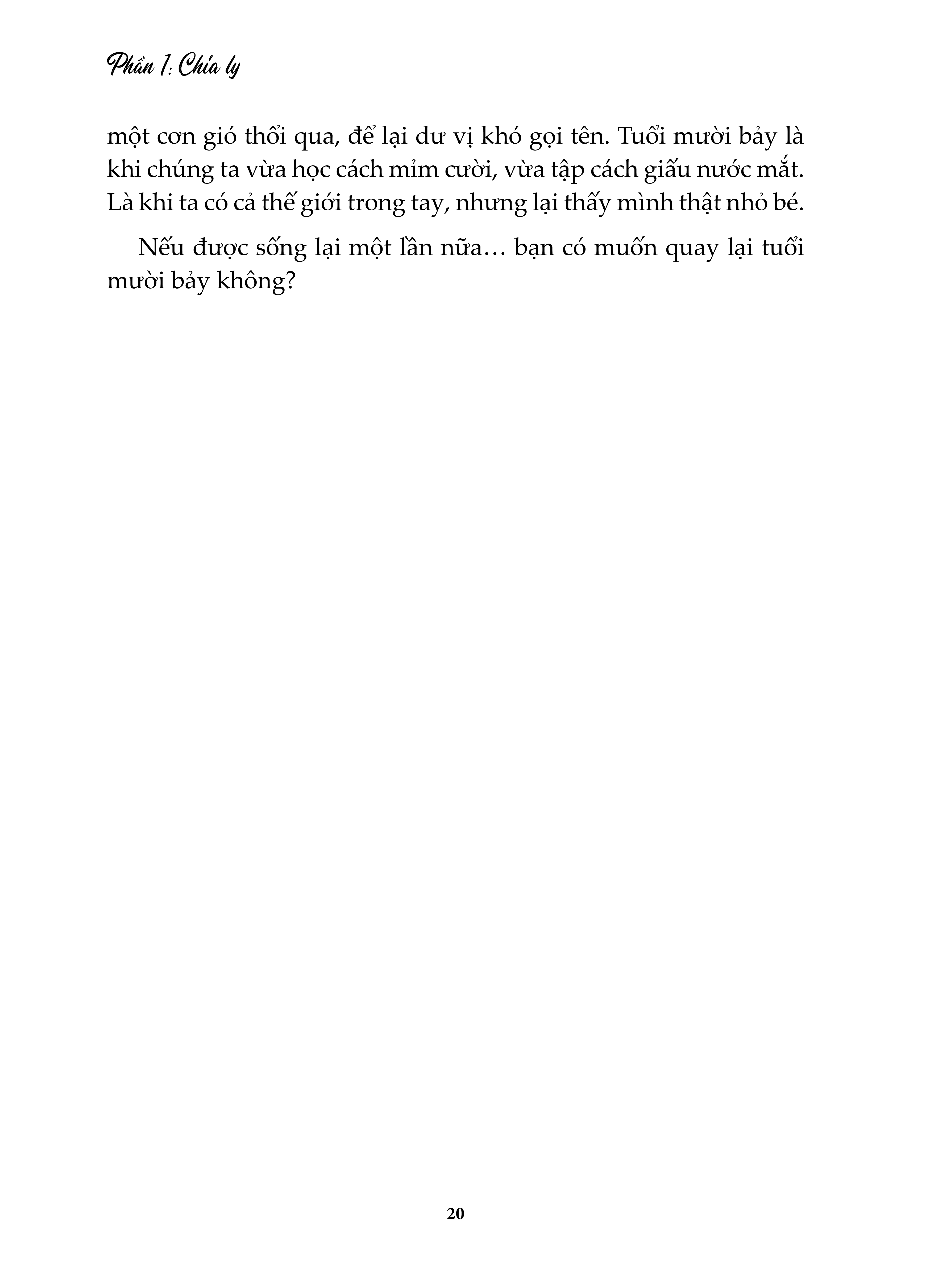 Khi định mệnh cho Hân cơ hội quay trở lại tuổi mười bảy, cô muốn lặng lẽ thay đổi, muốn giữ lại những điều quý giá, làm những chuyện mà trước kia cô chưa từng dám thử, để dũng cảm tiến bước về phía trước.