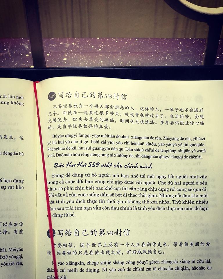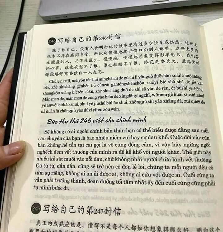 Mua tại Tiktok- Giới thiệu sách: 999 Bức Thư Viết Cho Chính mình (Song Ngữ Trung Việt Có Phiên Âm) - (Bản dịch chuẩn và đầy đủ) Tác giả: Nhật Phạm Số trang: 509 Năm phát hành: 2021 Nhà xuất bản Hồng Đức Với nền văn hóa lâu đời đặc sắc và vô cùng phong phú của Trung Quốc, ngôn ngữ Trung trở thành một ngôn ngữ được nhiều bạn trẻ trên thế giới yêu thích, trong đó có Việt Nam. Những cuốn sách song ngữ có phiên âm mang màu sắc hạt giống tâm hồn vừa giúp người học tiếng Trung nâng cao thêm vốn từ vựng, cách diễn đạt, vừa giúp họ làm mát tinh thần, chiêm nghiệm được nhiều triết lí sống chưa được ấn hành nhiều ở Việt Nam. Với mong muốn giúp những bạn trẻ yêu thích tiếng Trung nhưng trình độ chưa cao có thể tiếp cận được với những triết lí của cuộc sống cũng như phát triển được ngôn ngữ, chúng tôi xin được giới thiệu cuốn sách 999 bức thư viết cho chính bạn với phiên bản đầy đủ chữ Hán, phiên âm, tiếng Việt. Hi vọng rằng cuốn sách mà chúng tôi ví như một chai nước dành cho những kẻ bộ hành giữa sa mạc sẽ giúp ích được cho nhiều người trẻ có thêm nhiều năng lượng, động lực, sự tự tin để bước về phía trước. Các bạn đọc đi, tin tôi đi, các bạn có thể không cần một đôi giày xịn, một chiếc áo đẹp, nhưng cuốn sách này thì nên có, sẽ là báu vậtgối đầu giường của các bạn học tiếng Trung. Bức thư số 1 viết gửi bản thân: Bắt đầu từ ngày hôm nay, mỗi ngày đều phải mỉm cười, trên đời này, ngoài cái chết, tất cả chỉ đều là chuyện nhỏ. Cho dù có gặp phải chuyện buồn gì, cũng đừng tự làm khó bản thân; mặc cho ngày hôm nay có bao điều tồi tệ xảy ra, cũng đừng cảm thấy đau buồn. Ngày hôm nay là ngày bạn trẻ tuổi nhất trong tất cả những chuỗi ngày sau này, bởi vì còn có ngày mai, cho nên hôm nay mãi mãi vẫn chỉ là điểm xuất phát. 写给自己的第1封信 从今天开始,每天微笑吧,世上除了生死,都是小事。不管遇到了什么烦心事,都不要自己为难自己;无论今天发生多么糟糕的事,都不应该感到悲伤。今天是你往后日子里最年轻的一天了,因为有明天,今天永远只是起跑线。