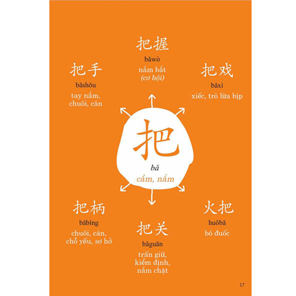 Mình ví dụ : Từ 把 này chẳng hạn, nó có thể phát triển thành rất nhiều từ khác như 把握, 把手, 把柄, 把关,火把,把戏.Như vậy chúng ta chỉ cần học 7 chữ Hán thôi, nhưng lại có được trong đầu 6 từ ghép với 6 nghĩa khác nhau.