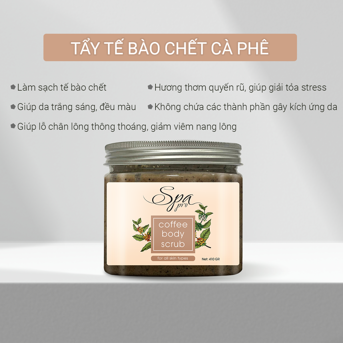 Mua tại Tiktok- TẨY DA CHẾT TOÀN THÂN COFFEE SPA PRO 410G THÀNH PHẦN: Công thức chứa các loại dược liệu tự nhiên: Cà Phê, Cam Thảo, Vitamin B3, Rau Má, Vỏ Dâu Tằm, Táo, Trà Xanh, Dướng Nhỏ, Tùng Nhung, Sơn Trà PHỐI HỢP VITAMIN E, PROVITAMIN B5 DƯỠNG DA MỀM MỊN, TRẮNG SÁNG. ỨNG DỤNG: Làm sạch cơ thể, làm sạch tế bào da chết, giúp lỗ chân lông thông thoáng, da tươi sáng mềm mại.