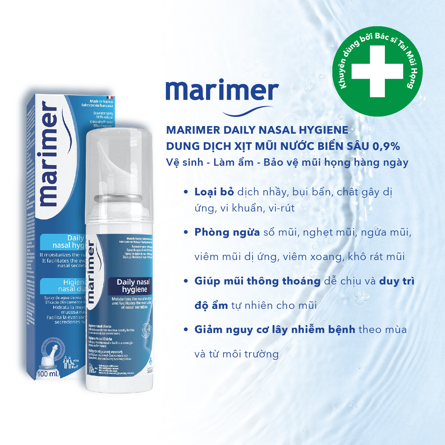 THÀNH PHẦN: Nước biển đẳng trương, nước tinh khiết. CHỈ ĐỊNH: Sử dụng hàng ngày, - Marimer Daily Nasal Hygiene: dành cho người lớn và trẻ em từ 3 tuổi. - Marimer Baby Daily Nasal Hygiene: dành cho trẻ