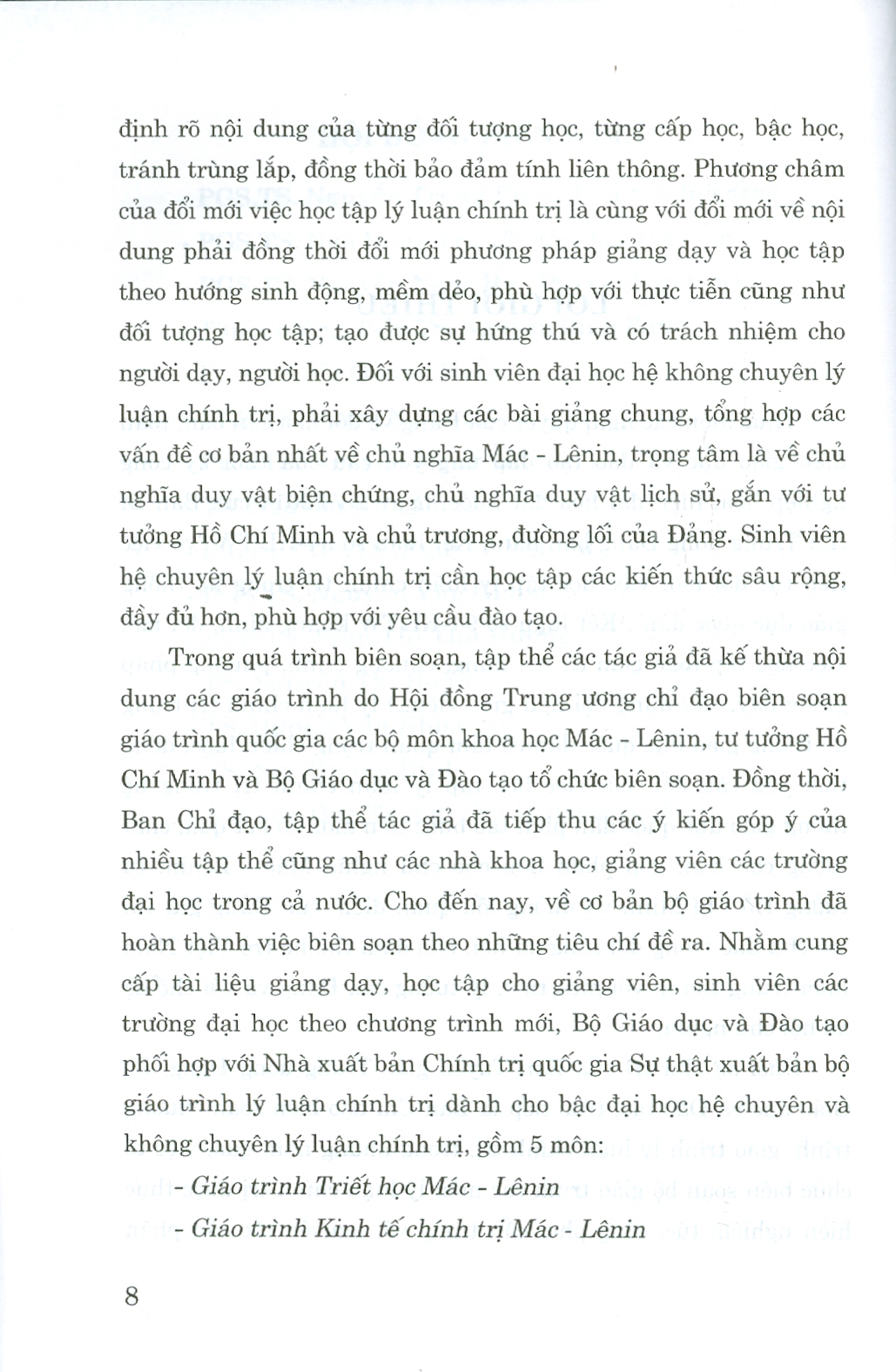 Bộ giáo trình lý luận chính trị gồm 5 cuốn dành cho bậc đại học hệ không chuyên lý luận chính trị. Bộ sách là tài liệu giảng dạy, học tập cho giảng viên, sinh