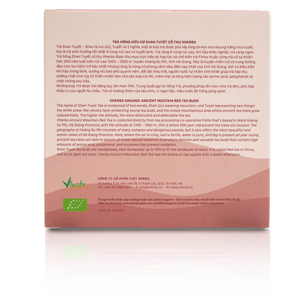 - Nước 2 là nước có vị ngon nhất . Có thể pha được từ 3 -5 lần nước. Bảo quản: Nơi khô ráo, thoáng mát. Tránh ánh sáng trực tiếp. Trà được đóng riêng từng bao, đảm bảo giữ nguyên hương vị trong suốt thời gian sử dụng Xuất xứ: Việt Nam Sản xuất tại: CÔNG TY CỔ PHẦN VIỆT HERB Giới thiệu trà hữu cơ Shan tuyết cổ thụ VHERBS Trà Shan tuyết cổ thụ Vherbs, thuộc vùng trà cổ tự nhiên hàng trăm năm tuổi trên vùng núi cao 1300 – 1900 m thuộc huyện Hoàng Su Phì, tỉnh Hà Giang. Một huyện miền núi với cung đèo đẹp nhưng cũng hiểm trở nhất của tỉnh Hà Giang. Theo kinh nghiệm gia truyền của các bậc lão niên , để có ấm trà ngon phải đảm bảo đủ các yếu tố: