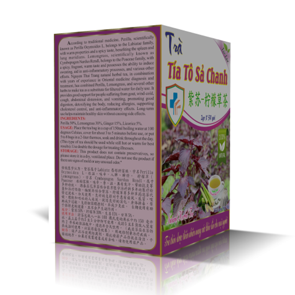 Theo y học cổ truyền, Cây Tía Tô có tên khoa học là Perilla Ocymoides L thuộc họ Hoa môi Labiatae, có tính ấm, vị cay lợi vào kinh tỳ - Phế. Sả Chanh (Củ Sả) có tên khoa học là Cymbopogon Nardus Rendl thuộc họ Lúa Poaceae, có vị cay the, thơm, tính ấm, có tác dụng ra mồ hôi, giúp chống viêm ..vv. Trà Thảo Dược Nguyên Thái Trang kết hợp cùng Phòng Chuẩn Trị Đông Y với nhiều năm kinh nghiệm trong việc khám và chữa bệnh đã đúc kết và phối hợp Cây Tía Tô, Sả Chanh cùng một số loại thảo mộc khác để làm trà thay nước lọc dùng trong ngày, Tăng Sức Đề Kháng, Giải nhiệt cơ thể, hỗ trợ tốt cho người bị Gout, Phong hàn, cảm ho, đầy bụng ói mửa, thúc đẩy tiêu hoá tốt, giúp giảm dị ứng, hỗ trợ kiểm soát Cholesterol, tiêu viêm. Dùng lâu giúp cho làn da khỏe mạnh mà không gây tác dụng phụ.
