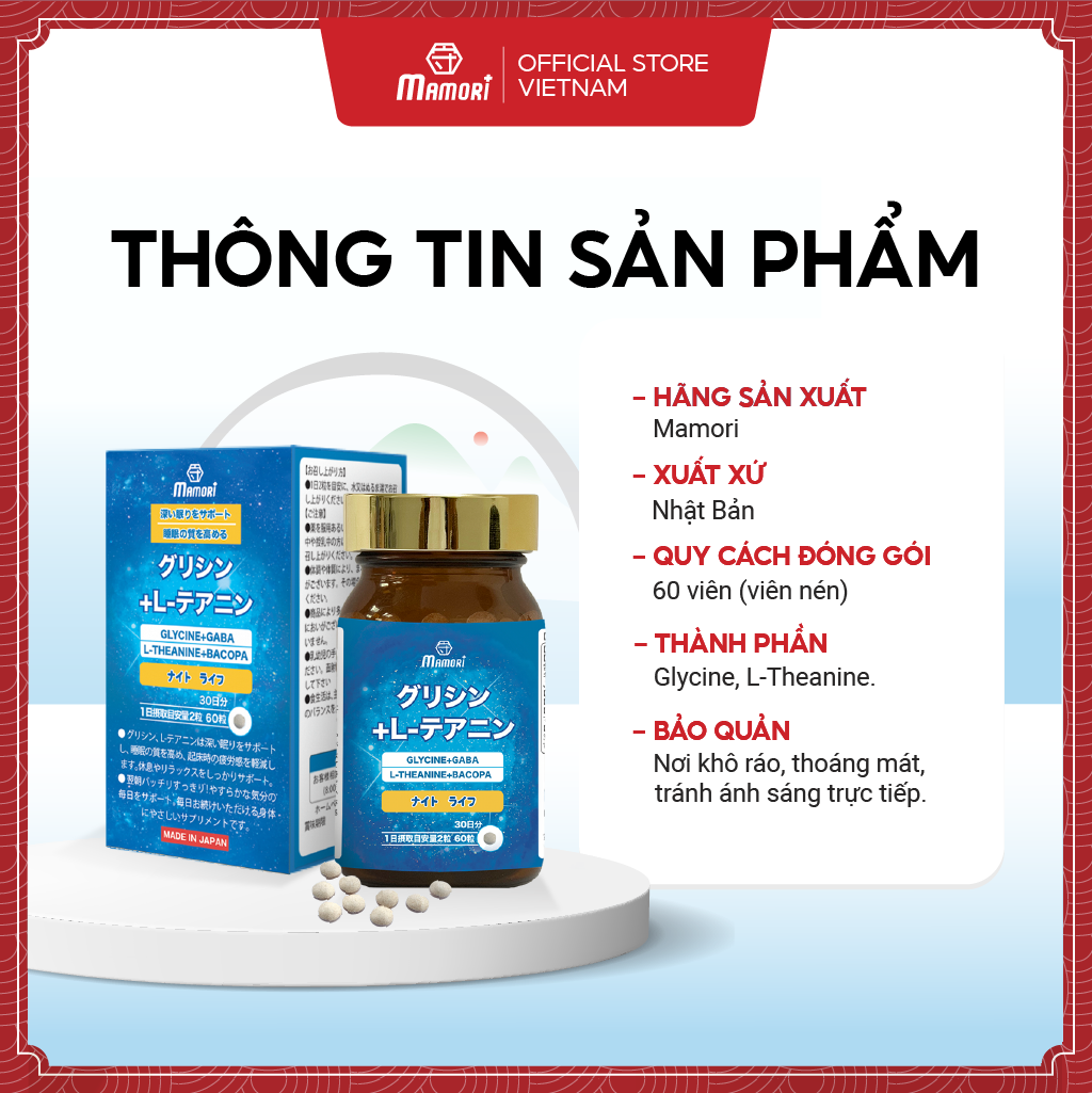 - Công Dụng Của Viên Uống Mamori Glycine L-theanine Viên uống Mamori Glycine + L-theanine là giải pháp lý tưởng cho những ai thường xuyên gặp vấn đề về giấc ngủ và căng thẳng. Sản phẩm hỗ trợ giảm căng thẳng, dễ dàng đi vào giấc ngủ sâu, giúp bạn tỉnh giấc với tinh thần thư thái và tràn đầy năng lượng.