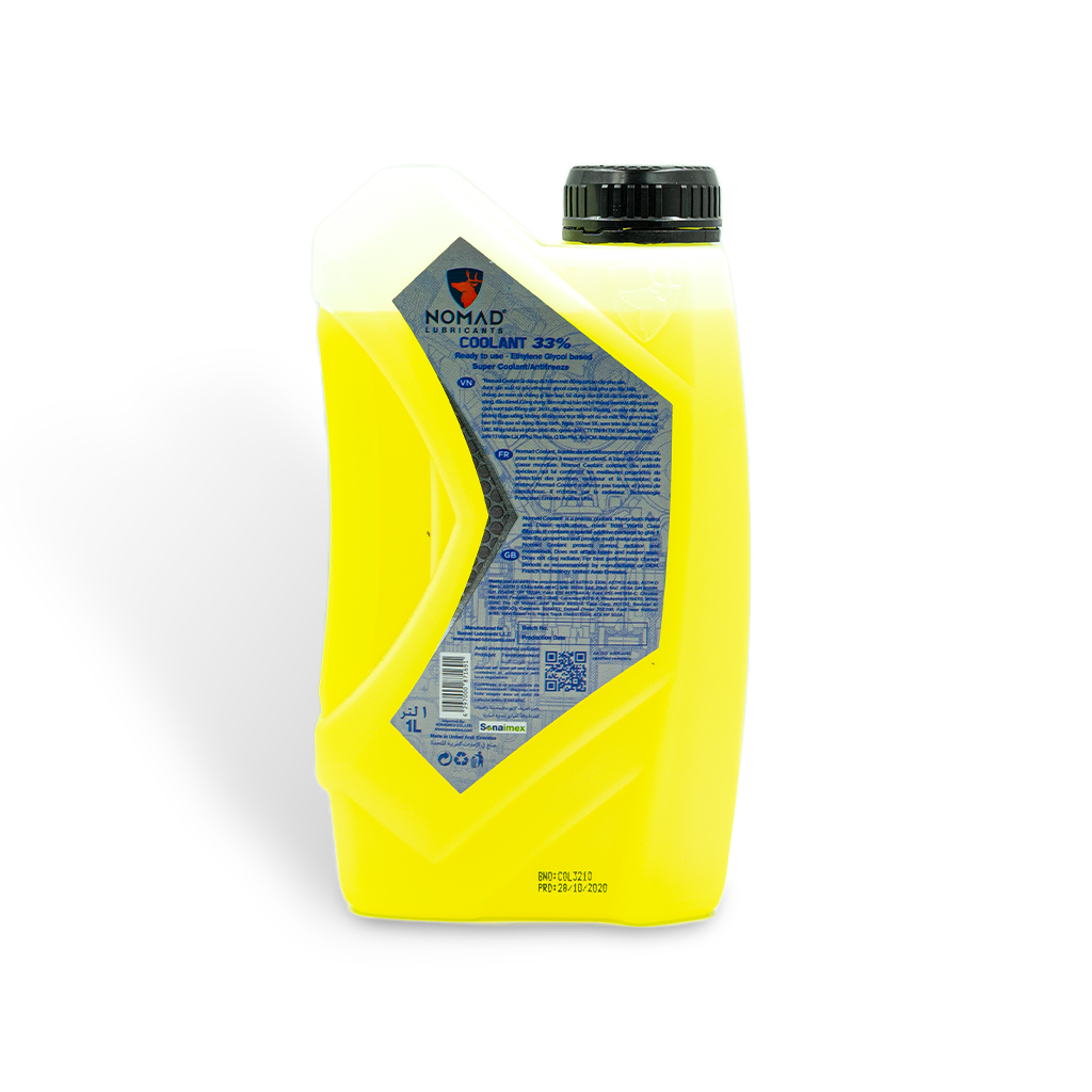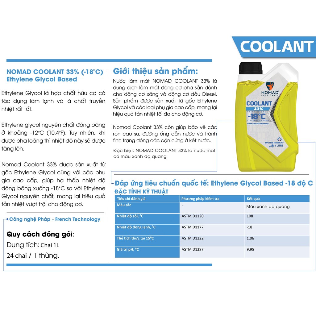 - Thu gom và xử lý đúng cách sau sử dụng để bảo vệ môi trường. Không vứt bao bì, không đổ dầu nhớt xuống đất, nguồn nước Nước làm mát động cơ NOMAD COOLANT 33%, -18 độ C (1L) Nước làm mát Nomad Coolant 33% (-18OC) được sản xuất từ gốc Ethylene Glycol – là hoạt chất có khả năng tăng cường khả năng tản nhiệt cho động cơ và hạ thấp nhiệt độ đóng băng xuống -18OC so với Ethylene Glycol nguyên chất (nhiệt độ đóng băng tại -12OC). Do đó, Nomad Coolant 33% đạt công dụng tản nhiệt vượt trội cho động cơ, lượng nhiệt dư thừa khi động cơ vận hành sẽ được dung dịch hấp thu, vận chuyển vào bộ tản nhiệt và giải phóng khỏi động cơ hiệu quả. Bên cạnh đó, Nomad Coolant 33% còn bảo vệ các đường ống dẫn nước, két nước và bơm nước trong hệ thống động cơ, tránh tình trạng đóng cặn cứng ở két nước. LỢI ÍCH SẢN PHẨM NƯỚC LÀM MÁT NOMAD