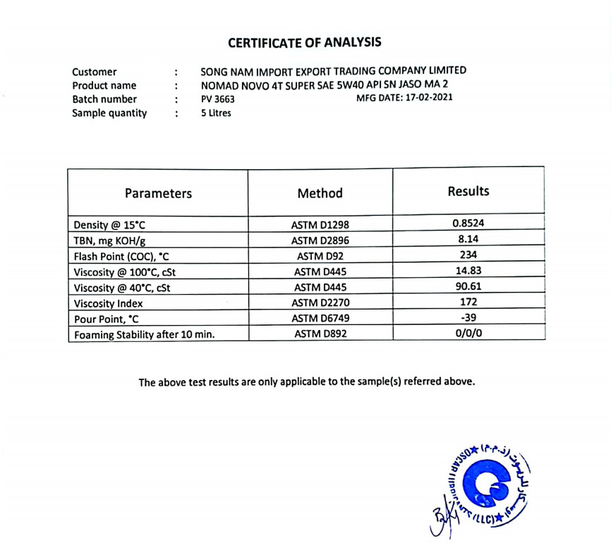 - Đóng thùng: 24 chai/ thùng VỀ THƯƠNG HIỆU DẦU NHỚT NOMAD LUBRICANTS Nomad Lubricants được thành lập năm 1998 tại xứ sở dầu mỏ khổng lồ Dubai. Ban đầu, Nomad chỉ tập trung vào một số dòng sản phẩm dầu nhớt chuyên biệt, dầu thủy lực và nước làm mát động cơ. Đến năm 2005, công ty bắt đầu mở rộng hoạt động sản xuất qua dầu nhớt vận tải, công nghiệp và hàng hải. Năm 2010, công ty mở rộng gấp đôi diện tích và công suất sản xuất. Năm 2015, công ty đầu tư dây chuyền công nghệ hiện đại từ Pháp, cho ra đời nhiều sản phẩm dầu nhớt tổng hợp toàn phần chất lượng cao, đáp ứng hoàn hảo các tiêu chuẩn quốc tế về dầu nhờn. Năm 2017, Nomad hợp tác cùng Công Ty TNHH TM Xuất Nhập Khẩu Song Nam (Sonaimex) bắt đầu phân phối thương hiệu Nomad tại thị trường Việt Nam. Công nghệ sản xuất hiện đại của Nomad kết hợp sự thấu hiểu thị hiếu người tiêu dùng nội địa của Sonaimex đã cho ra mắt dòng nhớt tổng hợp toàn phần cao cấp chuyên biệt cho các dòng xe tay côn, dung tích đặc biệt 1.1L và 1.3L chính thức đầu tiên tại Việt Nam. Sự thành công của sản phẩm giúp thương hiệu Nomad có tiếng vang trong phân khúc khách hàng hướng đến và được người tiêu dùng yêu mến lựa chọn. Công nghệ hàng đầu Châu Âu cộng với trụ sở ngay tại xứ sở dầu mỏ, NOMAD LUBRICANTS sở hữu lợi thế về sản phẩm chất lượng cao nhưng giá thành cạnh tranh. Danh mục sản phẩm của NOMAD rất đa dạng, từ dầu nhớt dành cho xe máy, xe ô tô, vận tải, tàu thuyền, máy móc công nghiệp nặng – nhẹ, đến các dòng phụ gia và bảo dưỡng chăm sóc động cơ. VÌ SAO NÊN CHỌN NHỚT NOMAD