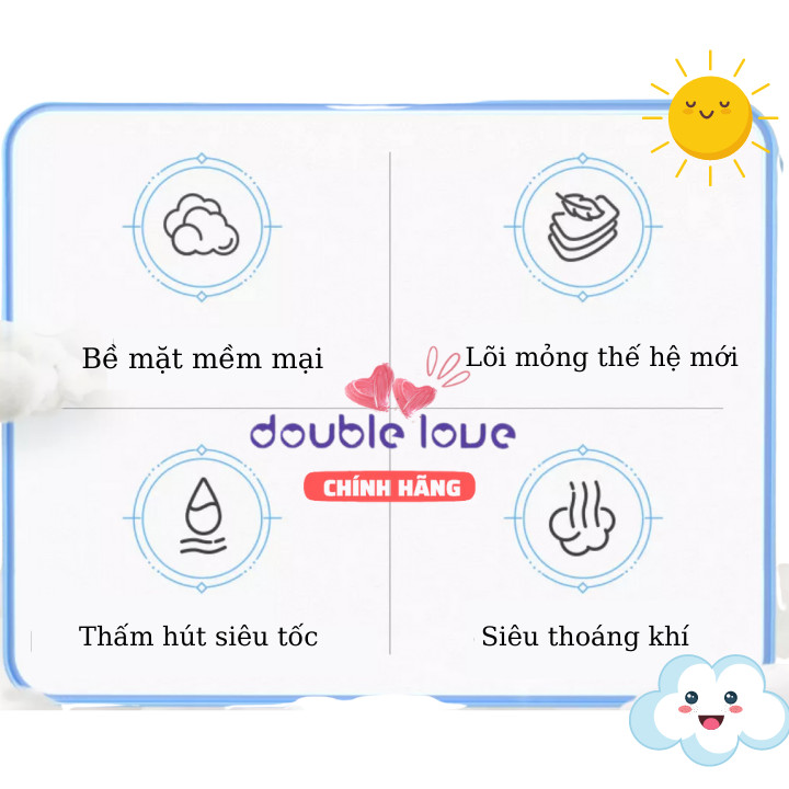 -Đặc biệt bỉm Double Love luôn thoáng khí giúp bé luôn khô thoáng và thơm mát (mùi hương dịu nhẹ, không bị nồng như các loại bỉm khác)