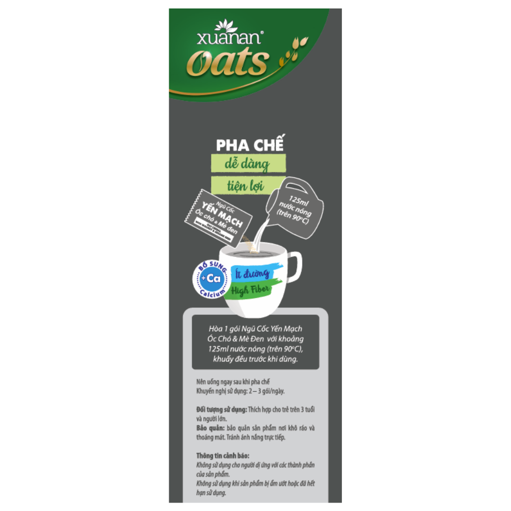Combo Ngũ Cốc Óc Chó Mè Đen 400gr (25G16 GÓI) + Gạo Lức Huyết Rồng 400gr (25G16 GÓI) + Yến Mạch Hạnh Nhân Hạt Chia 400gr (25G*16 GÓI) [ít đường] Yến Mạch, Óc chó và Mè đen là ba loại hạt được dùng khá phổ biến đối với mỗi gia đình vì chúng có tác dụng rất tốt cho sức khỏe. Đặc biệt, chúng phù hợp sử dụng với nhiều lứa tuổi, ngay cả trẻ nhỏ. Khi kết hợp 3 nguyên liệu này trong chế biến ngũ cốc thì chúng là loại ngũ cốc “Ngũ cốc Yến mạch, Óc chó và Mè đen” siêu hương vị thơm ngon, dinh dưỡng, ngậy béo nhưng không ngấy. Ngũ cốc YẾN MẠCH Hạnh nhân Hạt chia giàu dinh dưỡng và năng lượng, được làm từ yến mạch và nhiều loại ngũ cốc, ngoài ra còn có Hạnh nhân và Hạt chia là hai dưỡng chất chuyên biệt. Sản phẩm được bổ sung thêm can xi và sử dụng ít đường. Vitamin, chất xơ và đạm tự nhiên là nguồn dinh dưỡng tốt cho sức khỏe. Thành phần: Ngũ cốc 35% (Yến mạch 10%, bột gạo lứt 6%, bột gạo, bột bắp, bột đậu nành, bột lúa mì, bột lúa mạch), Hạt chia 3%, bột Hạnh nhân 3%, sữa bột nguyên kem, bột dừa, bột kem thực vật, đường, muối i-ốt, Canxi 0.7%, maltodextrin, chất là dày xanhthan gum (E415), chất chống đông vón (E551), hương liệu tổng hợp dùng cho thực phẩm. 6.75 gr đường trong khẩu phần 25g. Ngũ cốc GẠO LỨT Huyet rong là thức uống thơm ngon bổ dưỡng, được làm từ gạo lứt, yến mạch và nhiều loại ngũ cốc. Sản phẩm được bổ sung thêm can xi và sử dụng ít đường. Vitamin, khoáng chất, chất xơ tự nhiên giúp hấp thu dinh dưỡng tốt và thanh lọc cơ thể. Thành phần: Ngũ cốc 32% (gạo lứt huyet rong 10%, yến mạch 6%, gạo lứt, gạo nếp cẩm 3%, bắp, đậu nành, lúa mỳ, lúa mạch), bột kem thực vật 29%, đường, đường ăn kiêng Isomalt, sữa tách béo 7%(Instant Skim Milk Powder &%), bột dừa, Canxi 0.7%, Muối I-ốt, maltodextrin, chất maltodextrin làm dày xanthan gum (E415), chất chống đông vón (E551), hương liệu tổng hợp dùng cho thực phẩm. 6.5 g đường trong khẩu phần 25g Đối tượng sử dụng: Trẻ từ 3 tuổi trở lên và người lớn. Đặc biệt là người ăn theo chế độ ăn giảm đường. Hướng dẫn sử dụng: Hòa 1 gói Ngũ cốc với khoảng 125ml nước sôi, khuấy đều trước khi dùng. Dùng 2-3 gói mỗi ngày Bảo quản: Bảo quản nơi khô ráo, thoáng mát; tránh tiếp xúc trực tiếp với không khí và ánh nắng mặt trời. Thông tin cảnh báo: Không dùng khi sản phẩm bị rách, mốc hoặc đã hết hạn sử dụng. Sản phẩm của: Công ty TNHH Thực Phẩm Dinh Dưỡng Xuân An