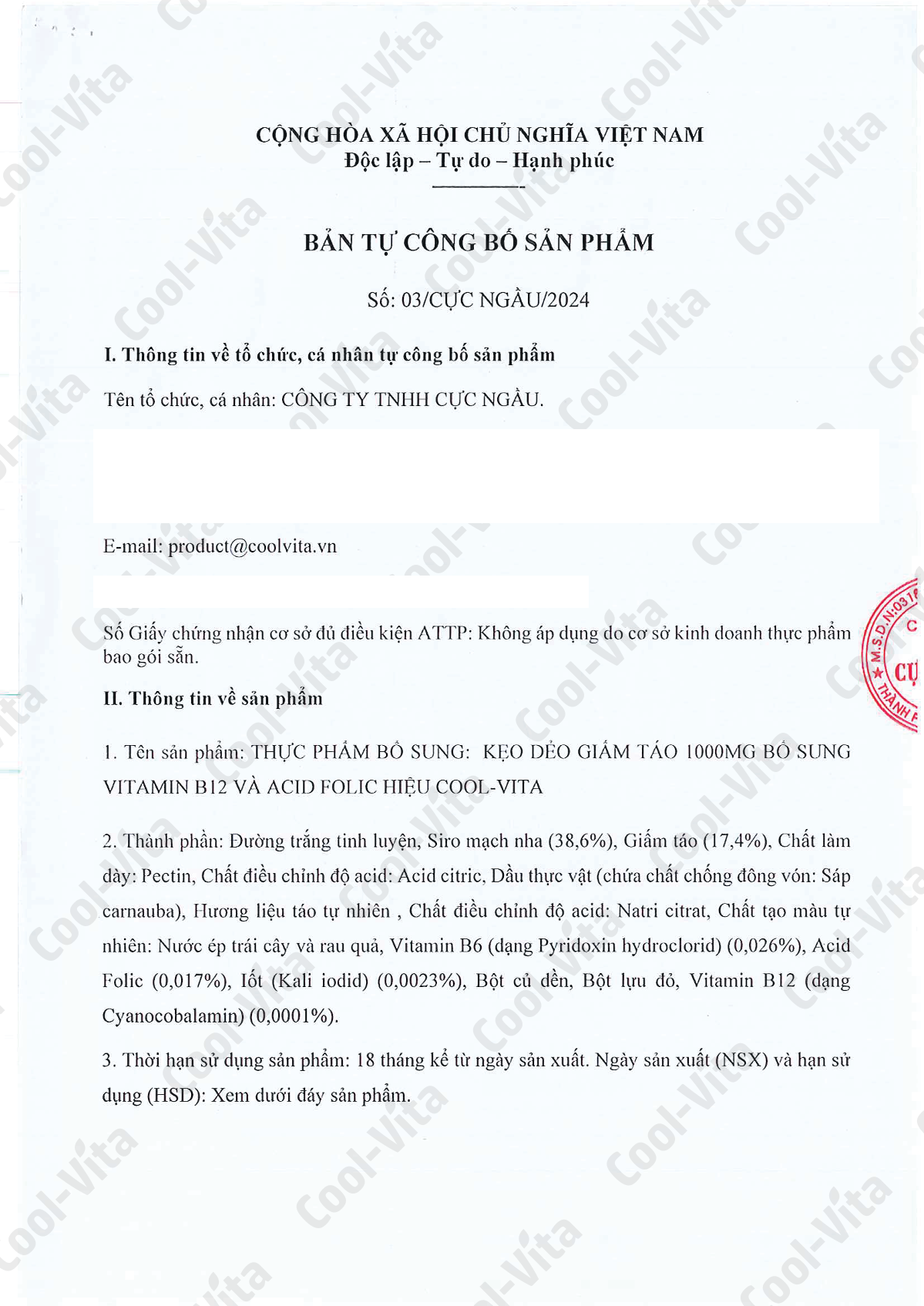 - Thân thiện với người ăn chay, an toàn và lành mạnh: Sản phẩm có chứa pectin thực vật, phù hợp cho người ăn chay, không chứa màu, hương liệu và chất bảo quản nhân tạo mà sử dụng màu sắc và hương vị tự nhiên. Vì sao nên chọn Kẹo Dẻo Giấm Táo COOL-VITA? Tiện lợi và dễ sử dụng: Chỉ với 2 viên kẹo dẻo mỗi ngày, bạn sẽ bổ sung 1000mg giấm táo và các dưỡng chất thiết yếu mà không cần phải pha chế phức tạp. Vị táo tươi mát, dễ chịu: Kẹo dẻo có vị táo tự nhiên, không gây ngán, mềm mịn, dễ ăn mà không bị dính răng. Sản phẩm an toàn, không chứa màu, hương liệu và chất bảo quản nhân tạo mà sử dụng màu sắc và hương vị tự nhiên, phù hợp với nhiều đối tượng người dùng. Khối lượng tịnh: 180g (60 viên x 3g) Thành phần: Đường trắng tinh luyện, Siro mạch nha (38,6%), Giấm táo (17,4%), Chất làm dày: Pectin, Chất điều chỉnh độ acid: Acid citric, Dầu thực vật (chứa chất chống đông vón: Sáp carnauba), Hương liệu táo tự nhiên, Chất điều chỉnh độ acid: Natri citrat, Chất tạo màu tự nhiên: Nước ép trái cây và rau quả, Vitamin B6 (dạng Pyridoxin hydrochlorid) (0,026%), Acid Folic (0,017%), Iốt (Kali iodid) (0,0023%), Bột củ dền, Bột lựu đỏ, Vitamin B12 (dạng Cyanocobalamin) (0,0001%). Hướng dẫn sử dụng: