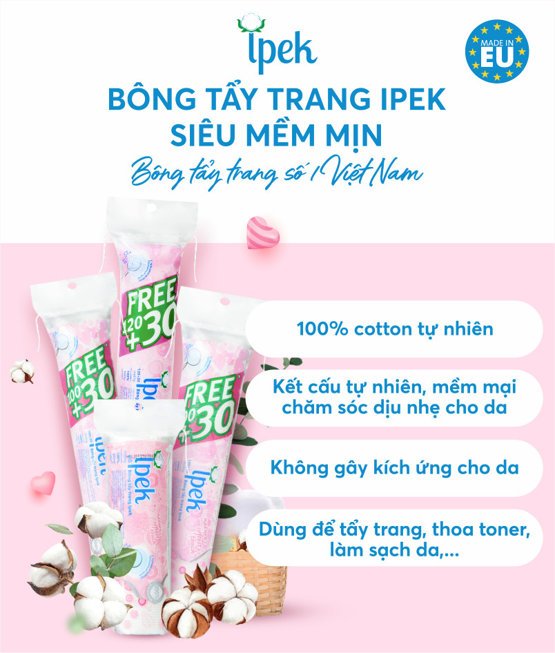 - Bông tẩy trang Ipek với công nghệ sản xuất tiên tiến giúp tẩy trang và làm sạch mọi bụi bẩn bám trên da bằng nước sạch, nước tẩy trang hay nước hoa hồng chăm sóc da.