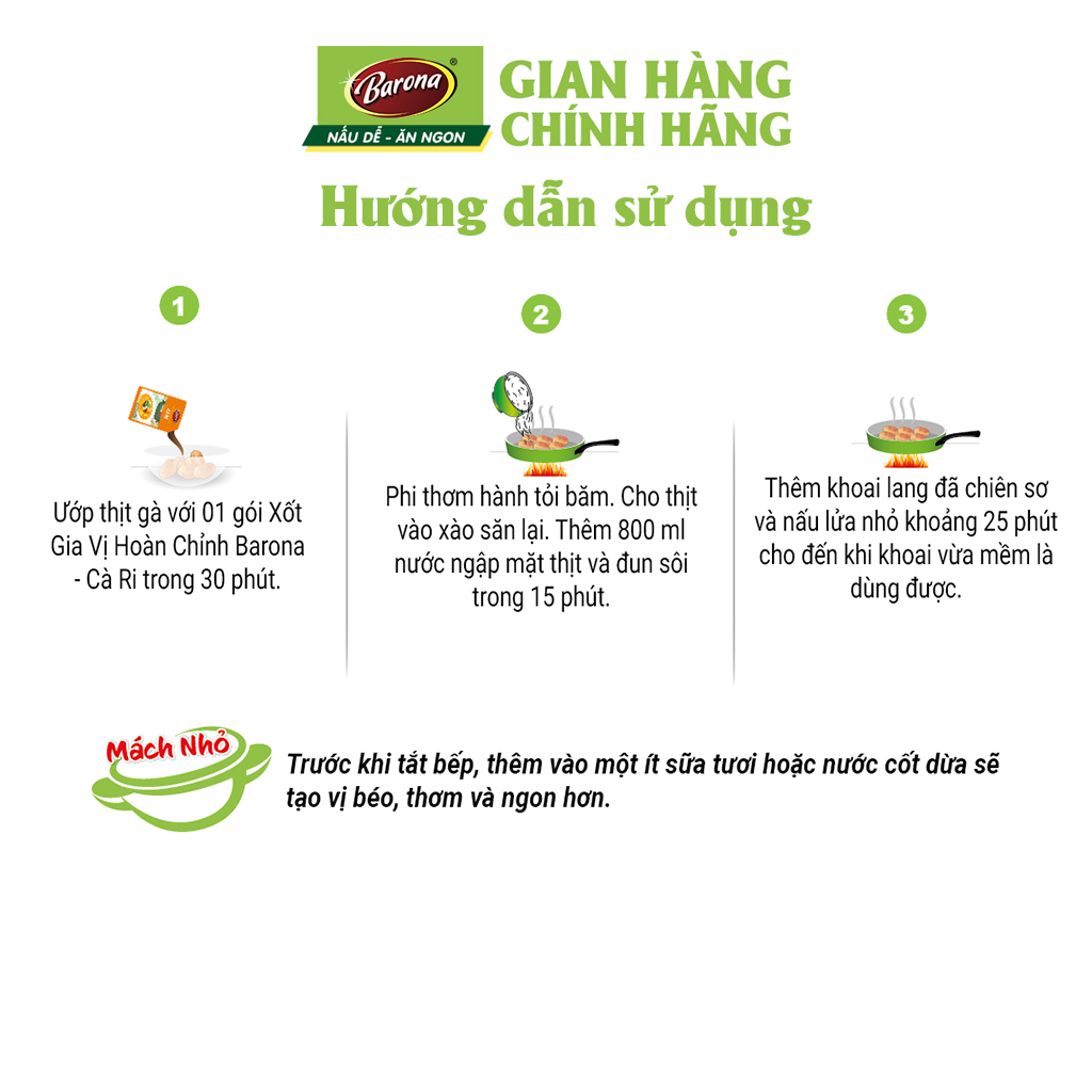 XỐT GIA VỊ HOÀN CHỈNH BARONA BÒ KHO 80G Xốt Gia Vị Hoàn Chỉnh Barona là công thức phối trộn độc đáo giữa CHIẾT XUẤT RAU CỦ QUẢ TƯƠI như hành, tỏi, me, cà chua…cùng