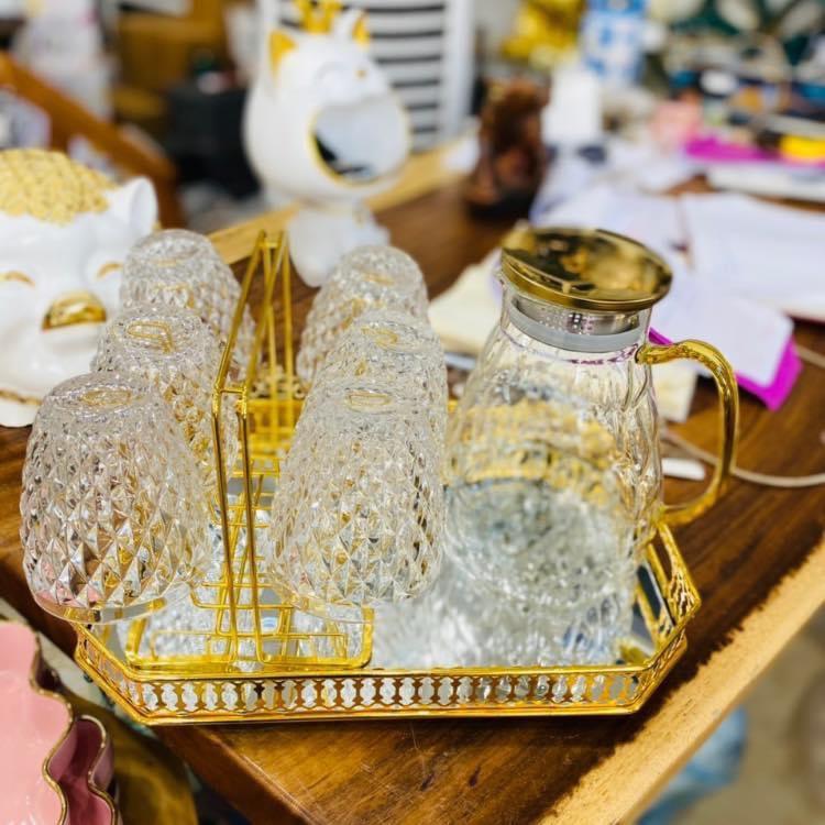 - Bộ combo bao gồm: 1 bình thủy tinh 1800ml + 6 cốc + 1 khay + 1 gía úp cốc kim loại mạ vàng ( khay giao ngẫu nhiên như hình dăng ) -Bình dung tích 1800ml. Nắp inox có zoăng cao su, đảm bảo an toàn cho sức khoẻ, thiết kế roong khit nắp chặt không lo bị rớt khi rót cạn nước