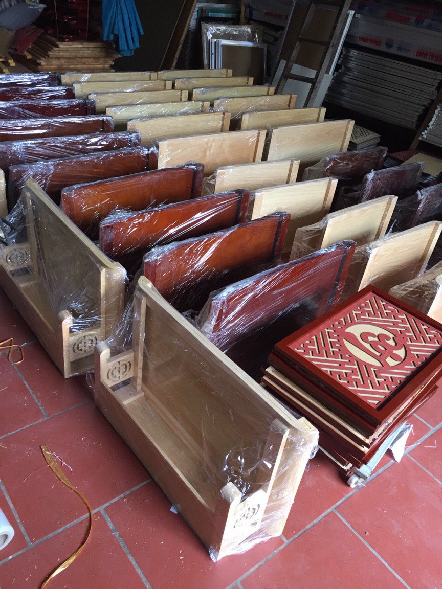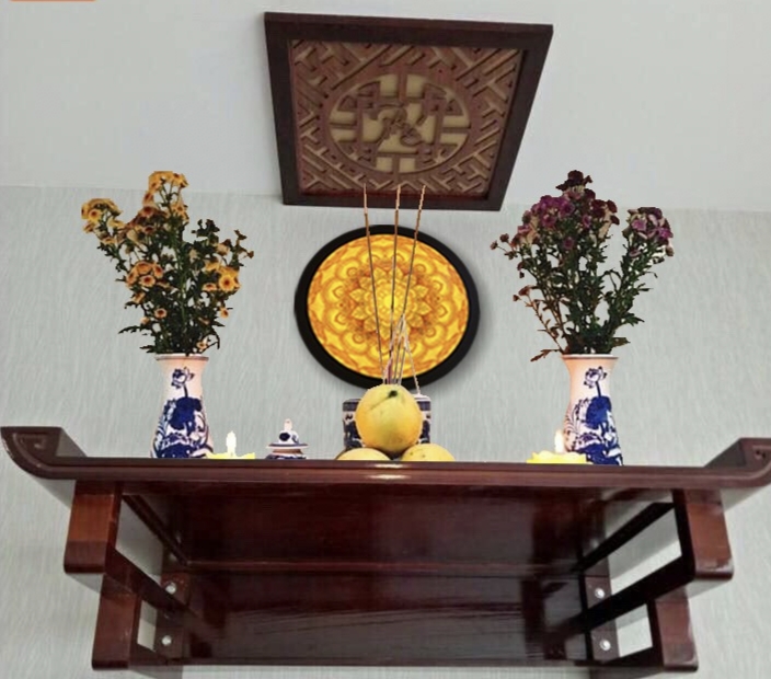 Combo phòng thờ gồm : 3 bàn thờ ( thổ công , gia tiên , phật ) + vách CNC gỗ sồi . Trả khách Hà Nội