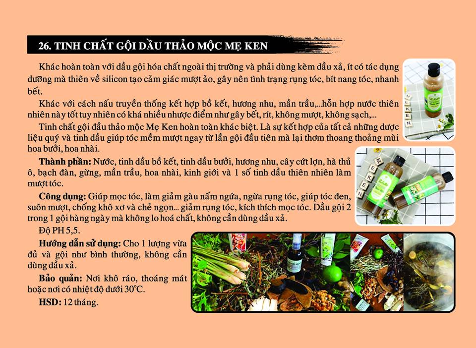 - Chiết xuất HOÀN TOÀN THIÊN NHIÊN an toàn và tốt tuyệt đối cho cả trẻ con… Sản phẩm hoàn toàn từ thiên nhiên giúp làm giảm gàu, giảm ngứa, ngăn ngừa rụng tóc, giúp tóc đen, suôn mượt, chống khô xơ và chẻ ngọn Dầu gội 2 trong 1 Gội hàng ngày mà không lo hoá chất, không cần dùng dầu xả Độ PH 5,5 Nam nữ già trẻ đều dùng chung hạn chế nhiều chai lọ Mùi thơm thiên nhiên dễ chịu không nồng nặc như hương liệu hóa chất Những ai bị rụng tóc, gàu, hay ngứa đầ MẸ KEN khuyên chỉ nên gội 1 mình Tinh chất thảo mộc thô Nó đã mềm mượt rồi. Hạn chế sử dụng dầu xả Tóc ai mà khô quá muốn ủ thêm, thì nên dùng dầu dừa, hoặc olive hoặc tinh bưởi MK trước để ủ rồi gội thôi là đẹp luôn. Nhiều nhất là 3 tháng, bạn sẽ có mái tóc không ngứa, không rụng, dày mau dài và bóng mượt Đặc biệt rất tốt cho trẻ con, bà bầu, sản phụ sau sinh THÀNH PHẦN : Nước, bồ kết, hương nhu, cây cứt lợn, hà thủ ô, bạch đàn, gừng, mần trầu, hoa nhài,… BẢO QUẢN: Nơi khô ráo, thoáng mát, tránh ẩm và có nhiệt độ dưới 30 độ C HẠN DÙNG: 18 tháng kể từ ngày sản xuất TINH DẦU BƯỞI NGUYÊN CHẤT MẸ KEN (100 ml) Là bài thuốc dân gian dưỡng tóc cực kì hiệu quả. THÀNH PHẦN: 100% tinh dầu bưởi CÔNG DỤNG: Giúp tóc khỏe, suôn, óng mượt, dưỡng ẩm cho mái tóc, giúp mọc tóc, ngăn ngừa rụng tóc HƯỚNG DẪN SỬ DỤNG: Bồ kết sao vàng ngâm với nước ấm nhỏ vài giọt tinh dầu bưởi vào nước gội đầu với trái bồ kết sẽ giúp mọc tóc. Hòa 40ml tinh dầu bưởi nguyên chất + 20ml tinh dầu Hương Nhu vào một lít dầu dừa tinh khiết. thấm ướt da đầu sau đó mat-xa hỗn hợp trên ( 15ml -20 ml) vào chân tóc vùng rụng tóc hoặc hói từ 20-30 phútđể cho tinh dầu thẩm thấu vào nang tóc. sau đó gội sạch lại đầu bằng dầu gội đầu. mỗi tuần 3 lần, saumột thời gian bạn sẽ có mái tóc đen dày, óng mượt. Cách dùng tinh dầu vỏ bưởi: Massage toàn thân với dầu nền. Dùng để xông hương với đèn điện xông hương hoặc lò đốt nến Có thể bôi trực tiếp lên da đầu để hỗ trợ trị chứng rụng tóc, kích thích mọc tóc. Phương pháp xông hơi: Nhỏ 3-4 giọt tinh dầu vào khoảng 1/4 lít nước sôi, dùng hơi nóng để xông mặt và hít thở đều 10 -15 phút. Tác dụng se lỗ chân lông, giảm độ nhờn và kích thích tuần hoàn máu; tốt cho họng (dùng trong các phòng xông hơi, sauna…).