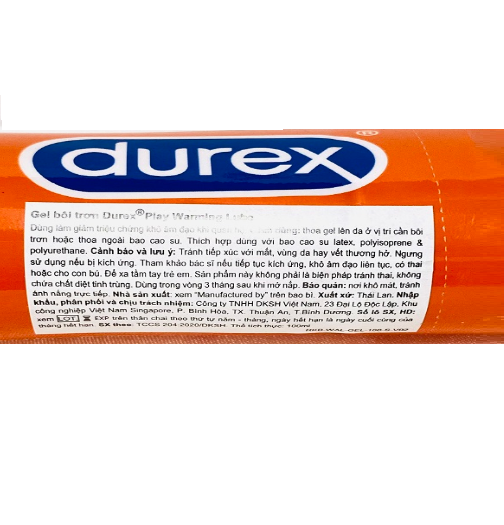 Dung dịch bôi trơn Durex Play Warming Durex Play Warming là sản phẩm bôi trơn làm ấm được sản xuất trên dây chuyền tiên tiến của hãng Durex – Thái Lan. Dung dịch bôi trơn