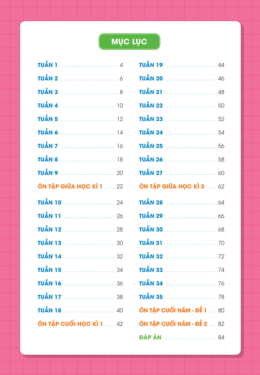 - Hệ thống các bài tập phong phú, mang tính tổng hợp và ôn luyện toàn diện. Hệ thống bài tập đa dạng, lượng phù hợp với việc học cuối tuần để các con vẫn có thời gian thư giãn và vui chơi. Đặc biệt, sau mỗi kì sẽ có bài ôn tập giữa kì và cuối kì giúp con có tài liệu ôn tập cho các kì kiểm tra.