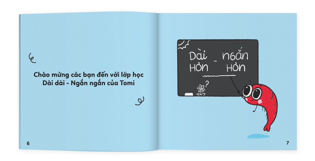 - Trong cuốn sách "dài ngắn" Tomi đóng vai là giáo sư thông thái và mở lớp học Ngắn ngắn – Dài dài. Cậu lần lượt đưa ra các sự vật và đố bố mẹ của mình biết sự vật nào ngắn hơn và sự vật nào dài hơn. Thông qua theo dõi buổi học của Tomi, bé sẽ học được phép so sánh DÀI – NGẮN.